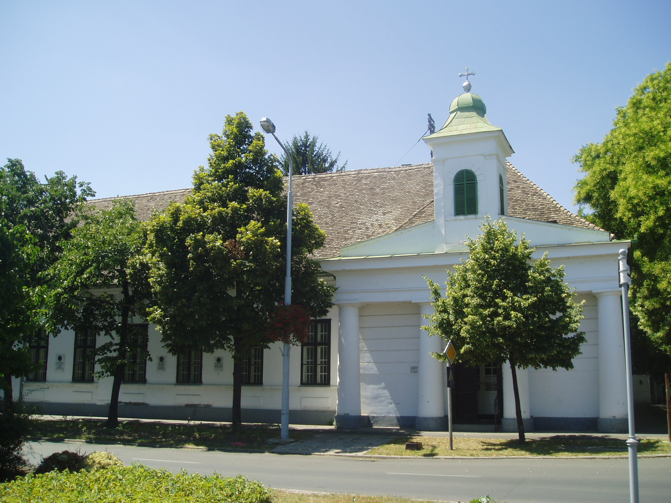 Nyilvános 1128 | 1577 | Makó, Csanád vezér tér 12. | A volt püspöki nyaralókastélyt a Temesvárott lakó Kőszeghy László csanádi püspök emeltette 1826-ban a hozzá csatlakozó dór oszlopos kápolnával együtt. Az alföldi klasszicizmusra oly jellemző, hosszú épületegyüttes megjelenését fokozzák párkány- és frízdíszei, valamint jó árnyékhatású koronázópárkánya. A külső homlokzaton jeles, az épülethez kötődő csanádi püspökök, illetve püspöki helynök emléktábláit helyezték el. A diákotthonként működő épület nyaranta a Rudnay Gyula munkásságának hagyományaira épülő nemzetközi művésztelepnek ad otthont. A fénykép 2007 júliusában készült. Felh. irod.: Barangolások Csongrád megyében. Miskolc, Well-PRess, 1997 |