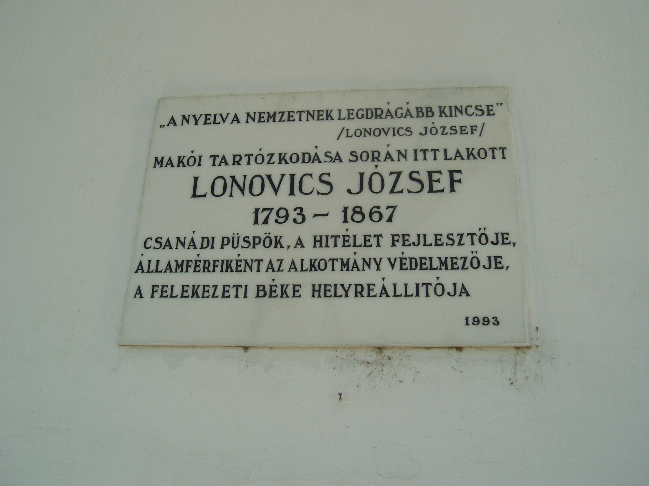 Nyilvános 1122 | 1566 | Makó, Csanád vezér tér 12. | A volt püspöki nyaralókastélyt a Temesvárott lakó Kőszeghy László csanádi püspök emeltette 1826-ban a hozzá csatlakozó dór oszlopos kápolnával együtt. A külső homlokzaton jeles, az épülethez kötődő csanádi püspökök, illetve püspöki helynök emléktábláit helyezték el. Lonovics József (1793-1867) csanádi püspök, majd egri, illetve kalocsai érsek emléktábláját születésének 200. évfordulóján állították. A fénykép 2007 júliusában készült. Felh. irod.: Barangolások Csongrád megyében. Miskolc, Well-PRess, 1997 |