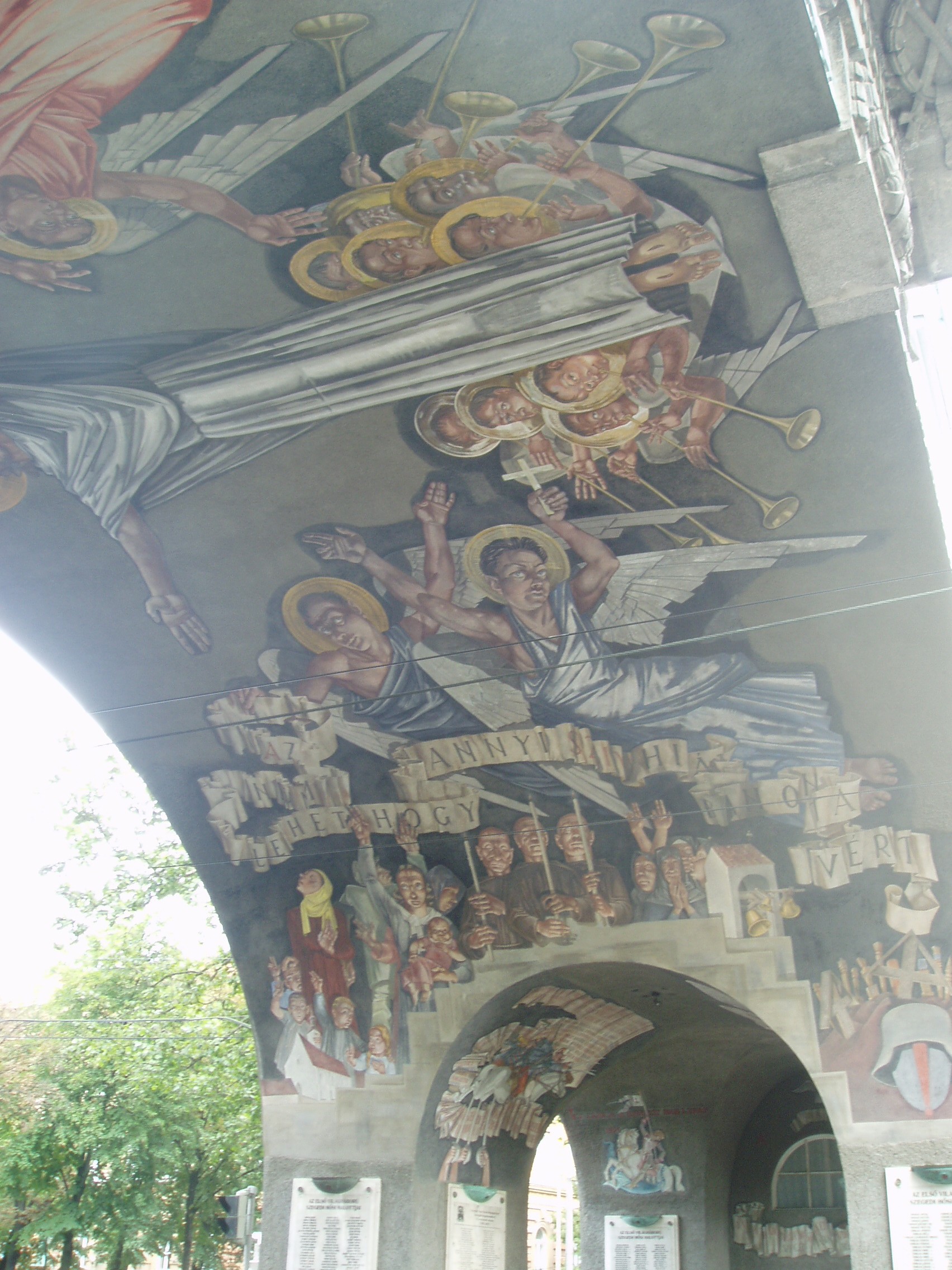 Nyilvános 1062 | 1586 | Szeged, Aradi vértanúk tere: Hősök kapuja | Az Aradi vértanúk tere déli oldalát a nagyszabású Hősök kapuja (Porta heroum) határolja. Az 1936-ban Pogány Móric tervei szerint épült kapu épült kapu honvédszobrai - az élő és a halott katona - Lőte Éva 1937-ben készült alkotásai, s az I. világháború áldozataira emlékeztetnek. A boltív freskóit Aba-Novák Vilmos készítette. A festményeket 1949-ben levakolták, csak a Millenniumra sikerült feltárni és helyreállítani őket. A művész a képsorozaton három témát jelenített meg: a háborús emlékezést, a hősi halottak dicsőítését és Horthy Miklós elindulását Szegedről. Középen, fejjel a tér felé Aba-Novák az ítélkező Krisztus mintegy 8 méteres alakját ábrázolta, lábainál a harsonás, ítélkező angyalok csoportjával. A kapu alatt kezdődik a nagyállomásra vezető Boldogasszony sugárút. A fénykép 2007 júliusában készült. Felh. irod.: www.vendegvaro.hu |