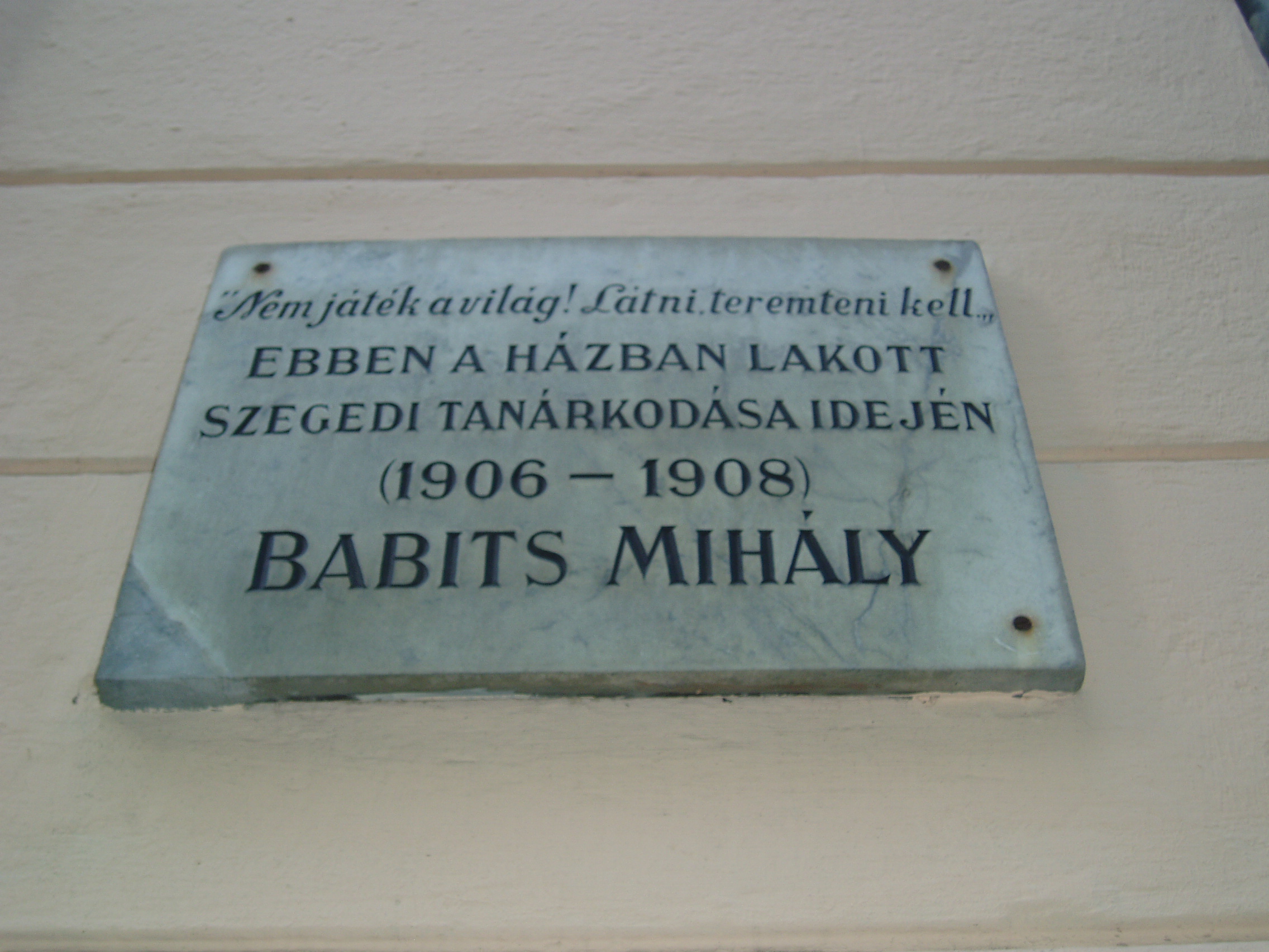 Nyilvános 1203 | 1810 | Szeged, Vitéz utca 16. | A Szentháromság utcát keresztező Vitéz utca 16. számú házán emléktábla olvasható: e házban lakott szegedi tanárkodása idején (lásd: Szeged, Horváth Mihály u. 2.), 1906 karácsonyától 1908 nyaráig Babits Mihály. 1956-ban, a tábla leleplezésekor jelen volt Szabó Lőrinc. Az emlékünnepségen ő idézte fel mesterének és barátjának alakját. Babits alkotói csöndet talált ebben a házban. A költőtárs Juhász Gyula, aki többször járt itt nála, 1924-ben megjelent "Babits Szegeden" című írásában így emlékezett: "Életét megosztotta az iskola és az irodalom között; volt idő, amikor csak az éjszaka óráit szakíthatta a költészetnek ... Megesett, hogy késő reggel benyitottam hozzá, és még mindig olvasmányába elmerülten találtam. Lámpája égett, pedig a nap már régen besütött az ablakán." Itt írta Babits a "Levelek Írisz koszorújából" című kötetének számos versét és itt érlelődött benne Dante-fordítása is. A fénykép 2007 júliusában készült. Felh. irod.: Péter László: Szeged. Bp. Panoráma, 1981 |
