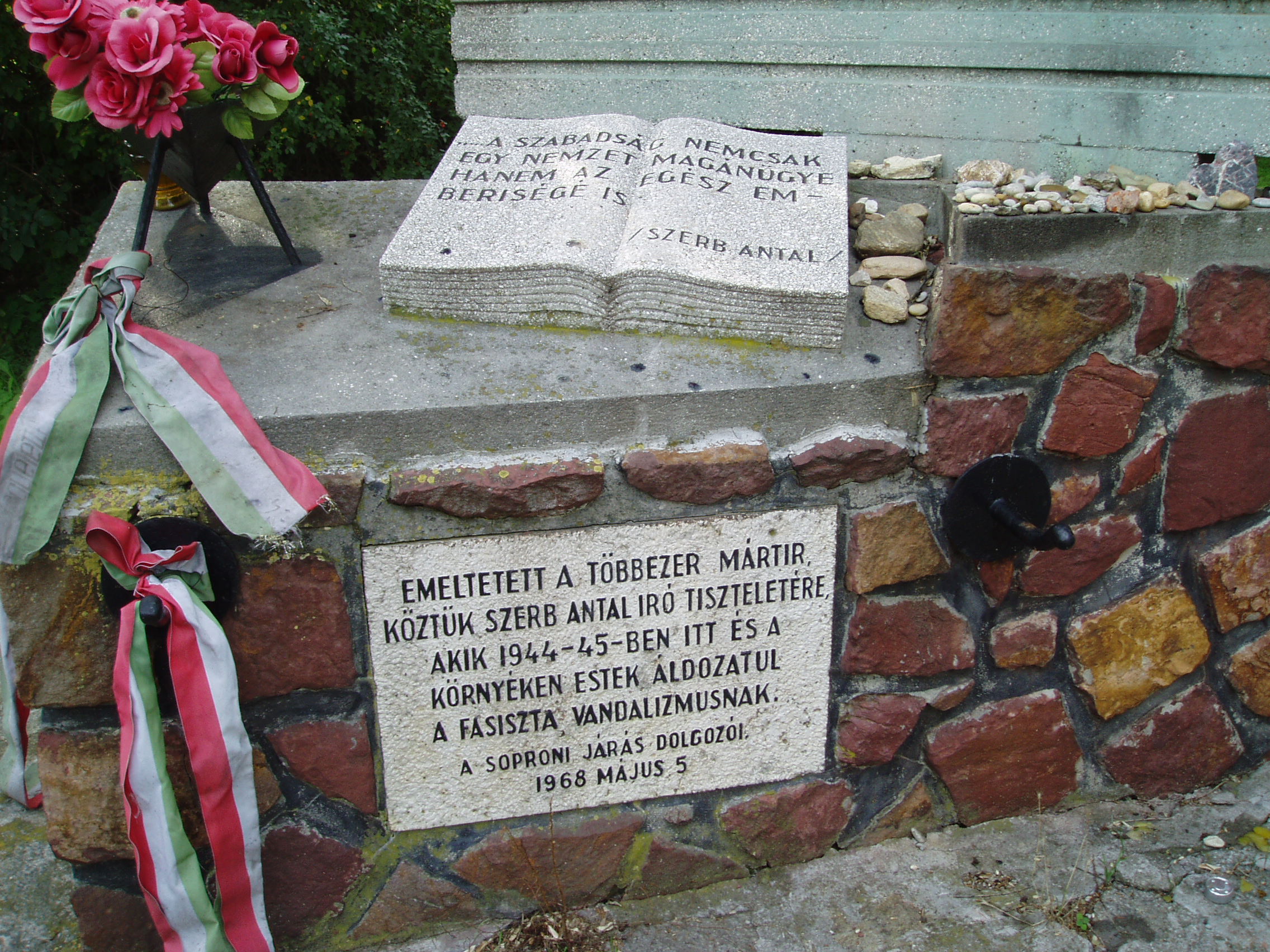 Nyilvános 1669 | 4038 | Balf, Temető: Mártíremlékmű | A II. világháborúban munkaszolgálatos tábort rendeztek be Balfon, ahol mintegy 2000 ember lelte halálát, közöttük Szerb Antal író, irodalomtörténész és Sárközi György író, költő. A Fodor János szobrászművész által készített emlékművet 1968-ban emelték az áldozatok tiszteletére a balfi régi temető kapujának közelében. Felirata Szerb Antal jelmondata: "A szabadság nemcsak egy nemzet magánügye, hanem az egész emberiségé." A fénykép 2005. szeptemberében készült. Felh. irod.: Látnivalók Győr-Moson-Sopron megyében. Miskolc, Well-PRess, 2000 |