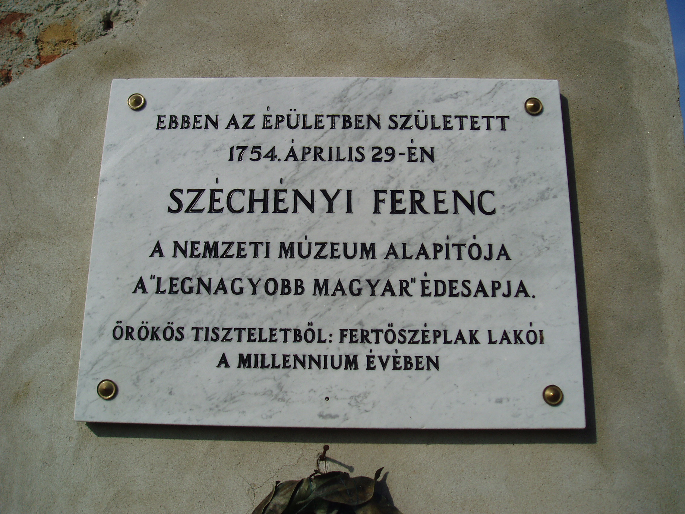 Nyilvános 1251 | 1968 | Fertőszéplak, Hősök tere 1. | Az egykori Széchényi-kastély ma elhanyagolt állapotú. Kapuja félköríves, oldalt toszkán félpillérekkel. Az udvari belső falon olvasható a Széchényiek jeligéje: "Deus me regit, nihil me deerit" (Isten velem van, baj nem érhet). A kastélyban született Széchényi Ferenc, a Nemzeti Múzeum és Könyvtár alapítója, Széchenyi István édesapja. Felh. irod.: www.vendegvaro.hu Látnivalók Győr-Moson-Sopron megyében. Miskolc, Well-PRess, 2000 |