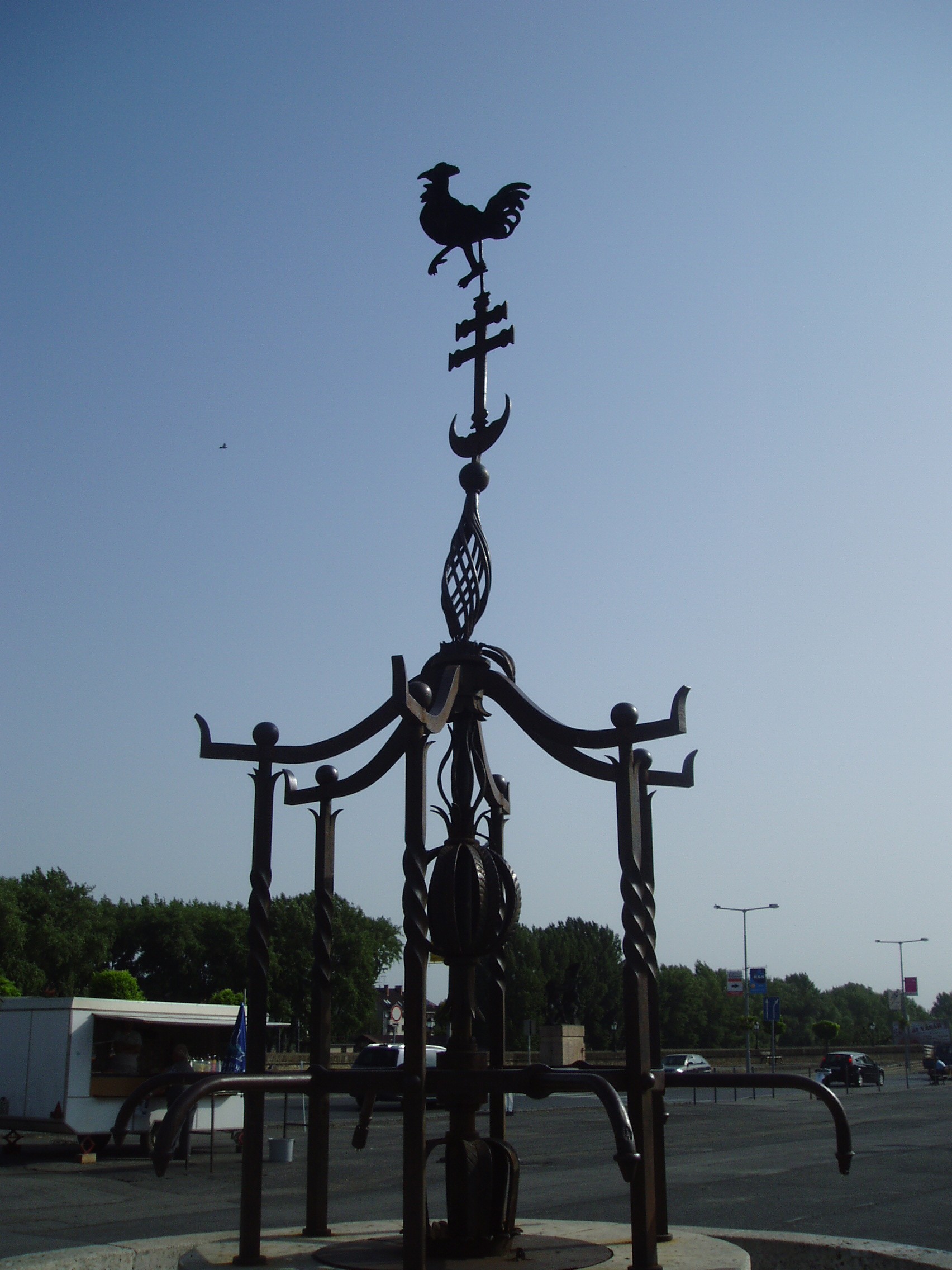 Nyilvános 1186 | 4133 | Győr, Dunakapu tér: Vaskakas | A Dunakapu tér közepe táján lévő díszkút tetejét a győri vaskakas másolata őrzi. A város jelképének is tartott madár eredeti példánya, amely ma a múzeumban látható, voltaképpen egy vörösréz lemezből kivágott szélkakas, amely a már nem létező Dunakapu építményét koronázta. Hozzá Győr várának a töröktől való 1598-as visszafoglalásához kapcsolódó legenda fűződik, amelynek forrása egy korabeli, Bécsben megjelent népének. E szerint a török dölyfösségében a Vízi-kapura aranyozott kakast helyezett el, és azt mondta, akkor űzik ki őket Győrből, amikor ez a kakas kukorékolni fog. A hagyomány szerint a vár visszafoglalásakor az érckakas az erős szélviharban valóban megszólalt... A felvétel 2008 május végén készült. Felh. irod.: Cziglényi László: Győr. Bp. Panoráma, 1981 |