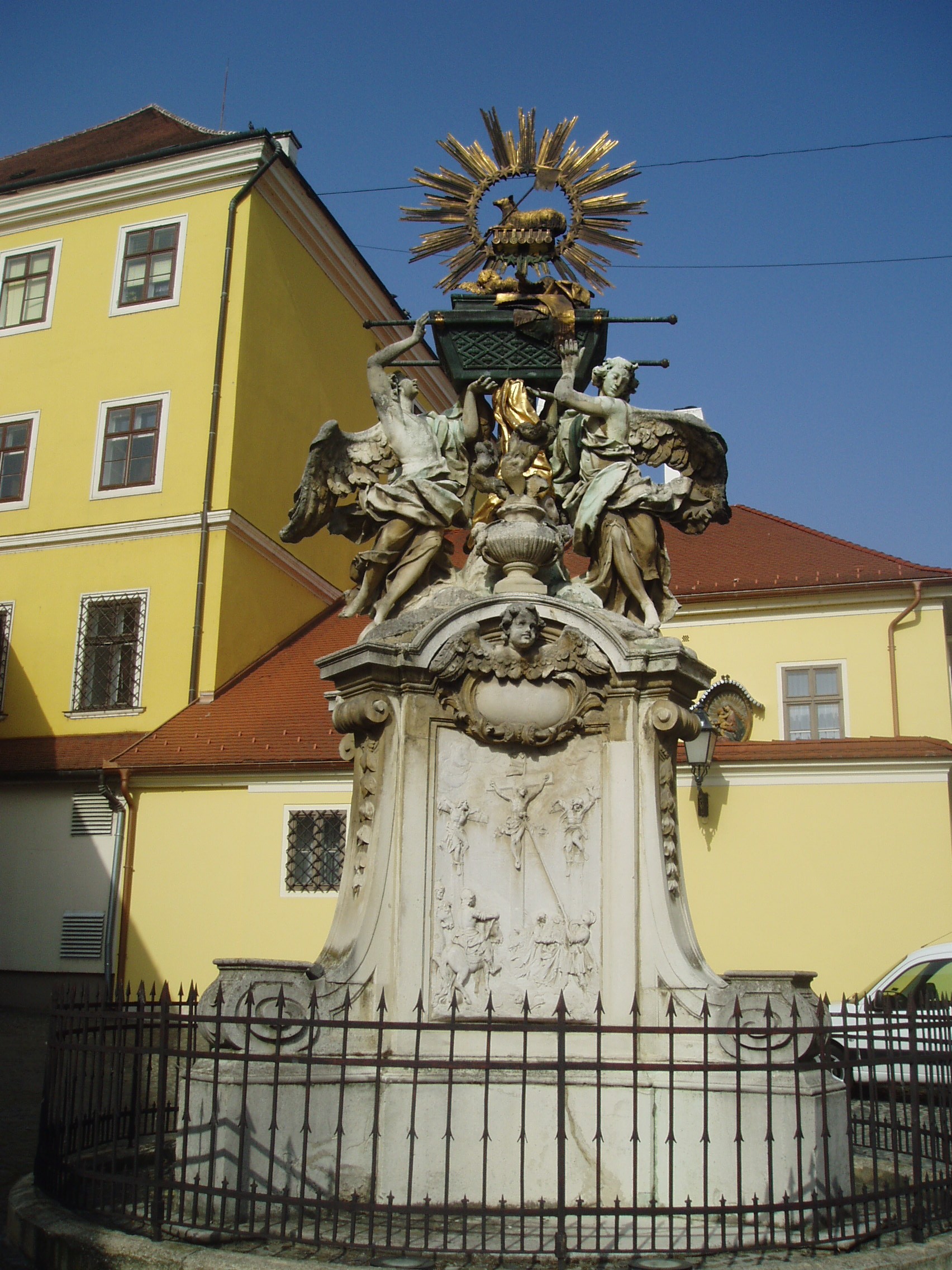 Nyilvános 1155 | 2192 | Győr, Gutenberg tér: Frigyláda | Az Apáca utca tengelyében, de már az olaszos hangulatú kis Gutenberg téren áll a nevezetes Frigyláda szoborcsoport, mely országos viszonylatban is korának egyik legkiemelkedőbb, barokk stílusú műalkotása. Magas alapzaton két lebegő angyal fogja közre a Frigyládát. Felette a glóriával övezett Isten Báránya, az Agnus Dei látható. Alapzatának oldalait vallásos vonatkozású domborművek díszítik. Itteni felállításához egy legenda fűződik. Eszerint 1729-ben egy egyházi körmeneten ministránsruhát öltött egy szökött katona. A vár őrsége felismerte, le akarták fogni, s a dulakodás következtében kiütötték a pap kezéből a monstranciát, amely eltörött. A győri polgárok megbotránkoztak az eseten, s III. Károly király engesztelésként emeltette az esemény színhelyén az emlékművet. A felvétel 2008 május végén készült. Felh. irod.: Cziglényi László: Győr. Bp. Panoráma, 1981 |