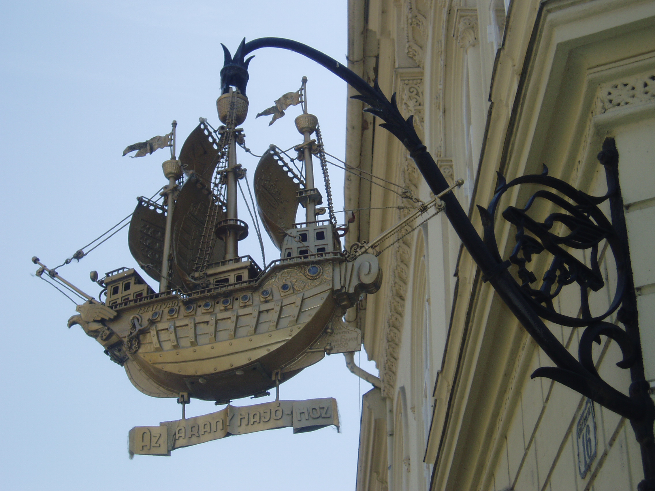 Nyilvános 1097 | 1948 | Győr, Jedlik Ányos utca 6. Aranyhajó cégér másolata | A Xantus János Múzeumban látható eredeti cégér fémlemezből készült, aranyozott hajótest a XV. századi caravellák mintájára. Az árbocokhoz futó kötélzet végén akasztó kampóval. Eredetileg a jelenlegi Széchenyi tér 1. sz. házon függött, egy fűszer- és gyarmatárú üzlet cégére volt. 1847-ben Haagen Ferenc Károly, 1863-ban Eitner L. és Vollnhofer, 1864-ben Vollhofner F.G. volt a tulajdonosa. Amikor új háza felépült a Dr Kovács Pál és a Jedlik Ányos utca sarkán, e házra helyezte át a cégért. Helyére 1939-ben Schima Bandi győri műkovács mester által készített másolatot helyezték el. A felvétel 2008 május végén készült. Felh. irod.: http://www.gymsmuzeum.hu |