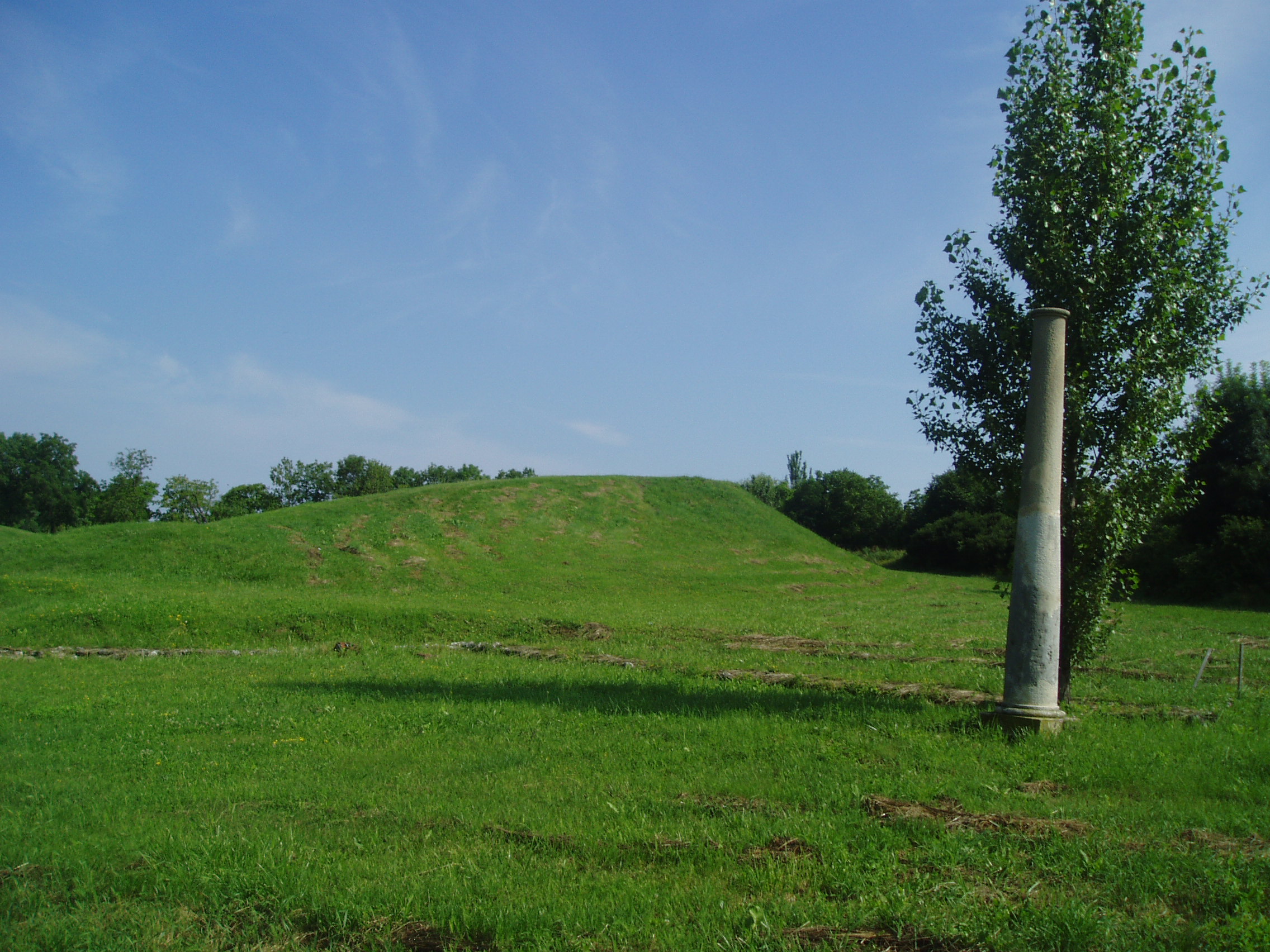 Nyilvános 1142 | 2707 | Sopron, Bécsi domb: Nemesis-szentély | Az amfiteátrum (lásd az előző képen) város felőli bejáratánál emelkedett a Nemesis-szentély. A mai Sopron helyén fekvő ókori települést az i. e. I. század elején alapították, központja a mai városközpont helyén volt. A fénykép 2008 júniusában készült. Felh. irod.: Czellár Katalin: Sopron. 3. jav. kiad. Bp. Panoráma, 2000 |