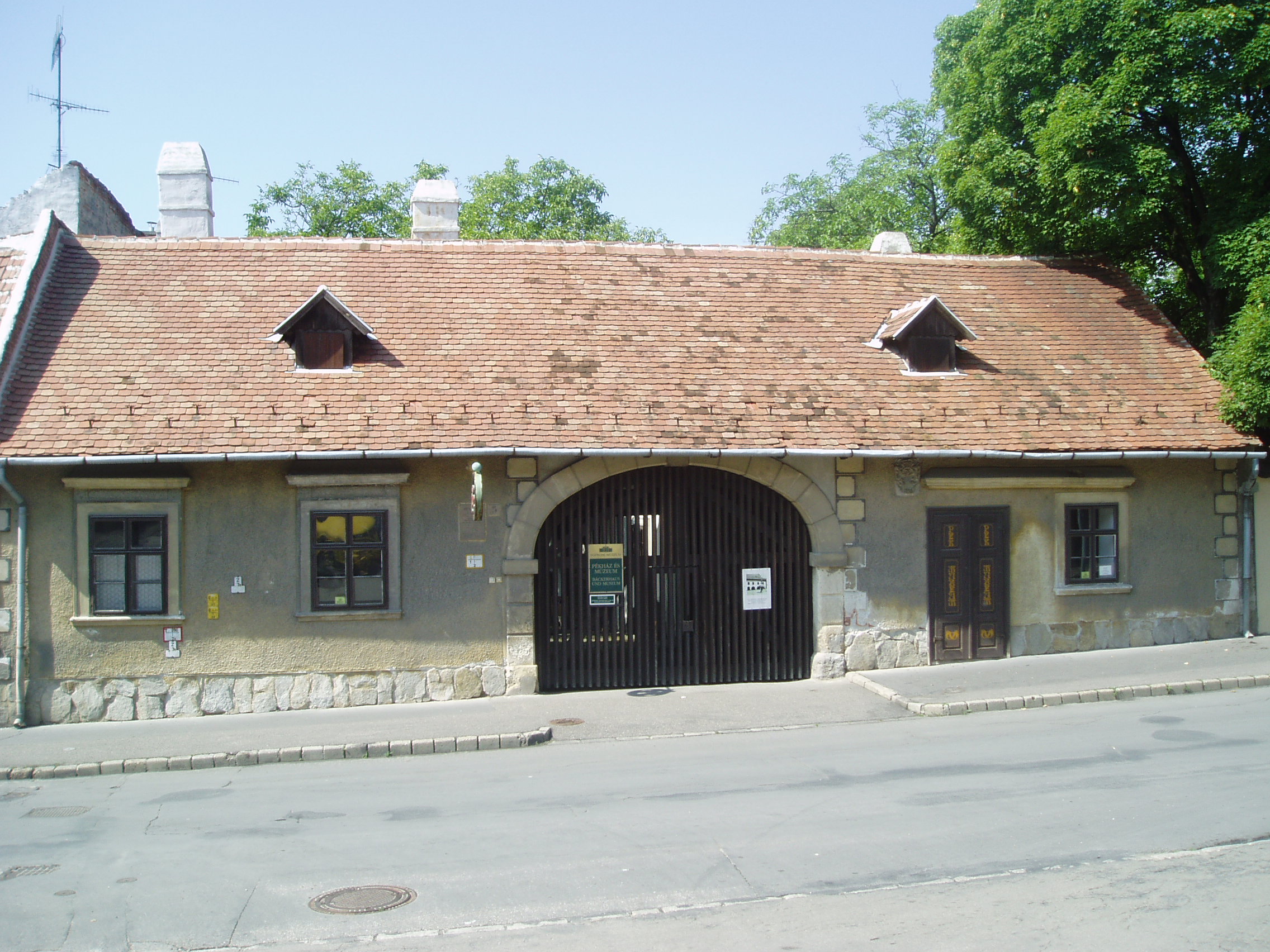 Nyilvános 1133 | 1640 | Sopron, Bécsi út 5. | Stílszerűen pékmúzeum működik az egyszerű, földszintes barokk lakóházban, amelynek tulajdonosai a XVII. század közepétől pékmesterek voltak, s melyben egészen 1950-ig folyamatosan pékség működött. Az épület 1700, majd 1749 körüli átalakításakor nyerte el mai formáját. Homlokzatát 1663-ból származó pékcímer díszíti: egy kettős zsemlyén álló, perecet tartó oroszlán. A fénykép 2008 júniusában készült. Felh. irod.: Czellár Katalin: Sopron. 3. jav. kiad. Bp. Panoráma, 2000 |