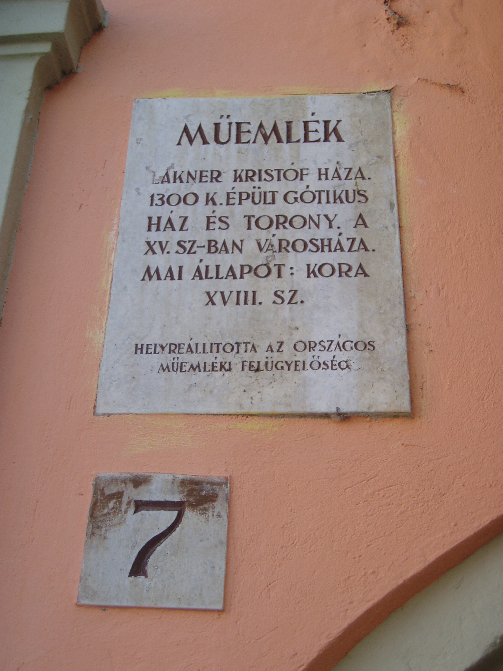 Nyilvános 1092 | 1473 | Fő tér 7. Lackner-ház vagy Tábornok-ház | Udvari, keleti szárnya és a toronyhoz csatlakozó háromszintes rész a XV. században épült. A XVII. század elején a legendás polgármester, Lackner Kristóf tulajdona volt. Ebből az időből származhat főhomlokzata. 1631-ben bekövetkezett halálával Lackner kívánságára a városra szállt, azóta is többször átépítették, illetve tűzvész okozta károk után helyreállították. A főhomlokzat előtti klasszicista erkély 180-ból származik. Ide szállásolták el egykor Sopron katonai parancsnokait, másik nevét erről kapta. A kép 2008 júniusában készült. Felh.irod.: Czellár Katalin: Sopron. 3. jav. kiad. Bp. Panoráma, 2000 |