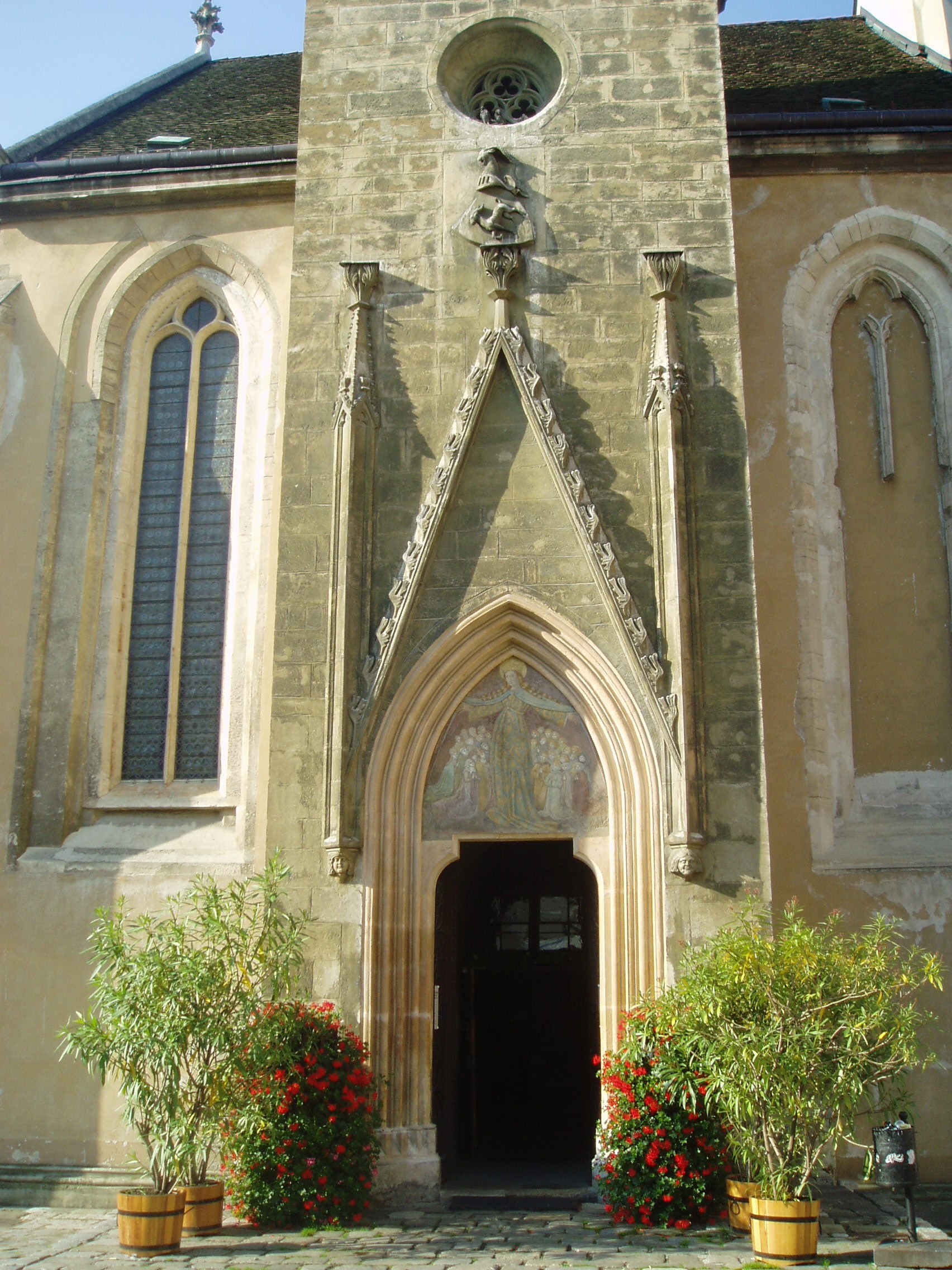 Nyilvános 1004 | 1516 | Sopron, Fő tér: Kecske-templom | A soproni Fő tér ékességét, a gótikus Kecske–templomot és a hozzá tartozó ferences kolostort a XIII. század második felében kezdték építeni. Tornya a XIV. század első negyedében készült el; mai alakja id. Storno Ferenc 1888–1894 között végzett helyreállításának eredménye. Szokatlan nevét a kapuzat felett látható faragott állatfiguráról kapta (a ma látható kecske Storno Ferenc faragványa, az eredeti a Káptalanteremben van), amelyről kiderítették a kutatók, hogy az építtető Gaisel család címerállata volt. Maga a templom faragott kőből épült, háromhajós, északi oldalán toronnyal díszített kora gótikus épület, berendezése a későbbi századokból származó barokk, illetve rokokó stílusú. Déli hajójának közepén áll egy XV. századból származó, márványból készült szószék. Ebbe ágyazták bele azt a fából faragott szószéket, amelyről állítólag Kapisztrán János prédikált a templom előtt a török ellen. A templom többször volt színhelye országos jelentőségű ünnepségeknek, reprezentációs alkalmaknak: 1553 és 1681 között öt alkalommal falai között tartották az országgyűlési ünnepeket; 1625-ben királyt (III. Ferdinánd), 1622-ben és 1681-ben királynét koronáztak benne. 1787-ben feloszlatták a ferences rendet, s az épületegyüttest később a bencések kapták meg. A fénykép 2008 júniusában készült. Felh. irod.: Czellár Katalin: Sopron. 3. jav. kiad. Bp. Panoráma, 2000 Albert Tibor: Sopron–Vas vármegyei útikönyv. Magyar múlt — osztrák–magyar jelen. Kőszeg, Városkapu Kiadó, 2005 |
