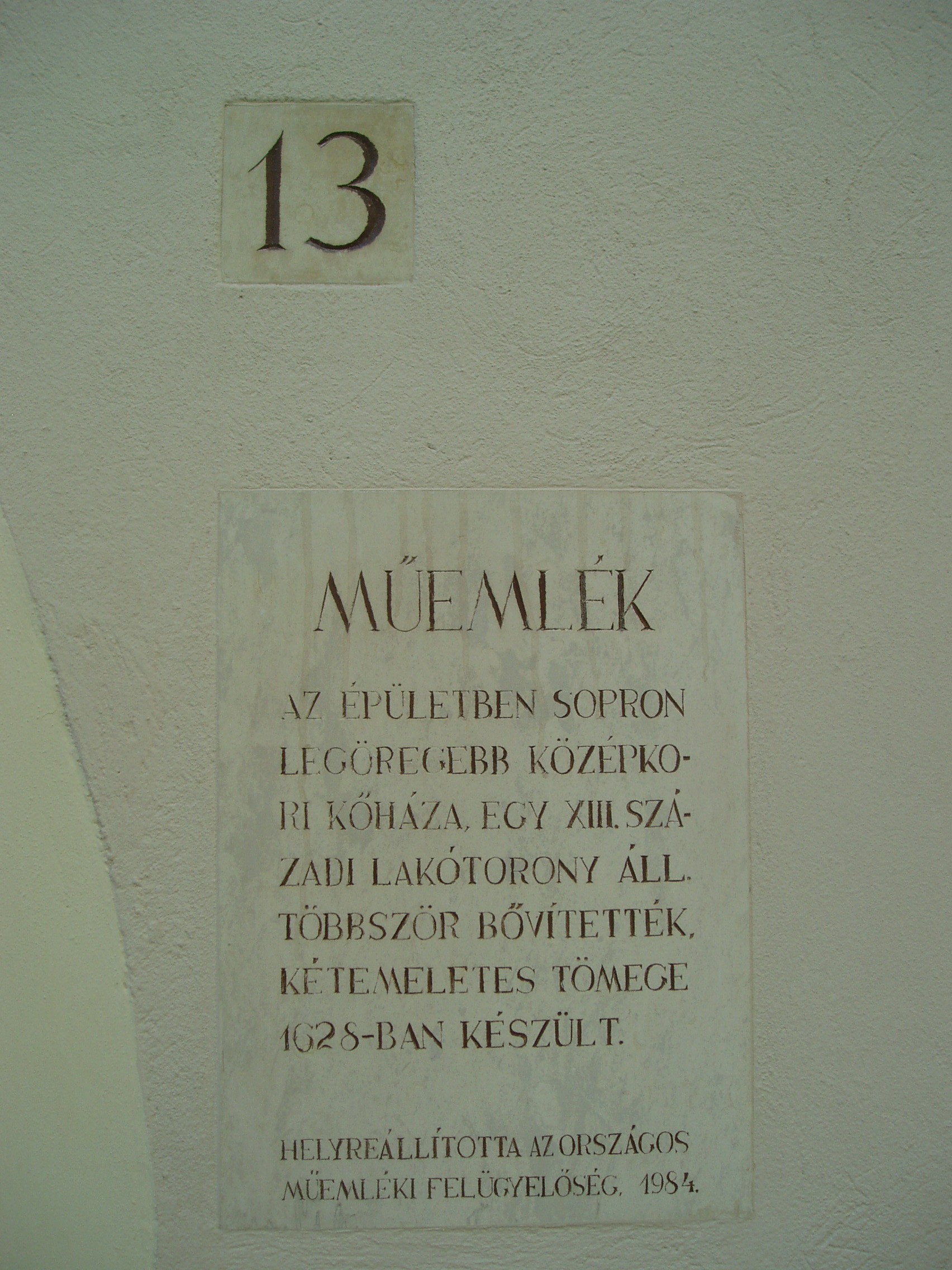 Nyilvános 1019 | 1426 | Sopron, Kolostor utca 13. | A lakóház Sopron eddig ismert legkorábbi világi kőépületének fennmaradt részeit őrzi: egy XIII. századi lakótornyot. A középkorban a mai Kolostor utca 13. és az Új utca 16. egy telek volt, s amikor a lakótornyos beépítést a harántházas váltotta fel, jómódú tulajdonosa a telek végében reprezentatív termet készíttetett. Ennek három szép gótikus ablakát az Új utca 16. számú épületen láthatjuk. 1628-ban az épületet kibővítették, majd kétemeletes formában épült újjá. Homlokzata egyszerű, követi az utca vonalát. A lakótoronyból megmaradt az alsó szint, a későromán keresztboltozat maradványa s egy alacsony emeleti ajtó. A mai épület kis udvarán festői szabad lépcső visz az emeletre, ahol egy toszkán oszlopos, pilléres, keresztboltozatú loggia van, fölötte zárt erkéllyel. A fénykép 2008 júniusában készült. Felh. irod.: Czellár Katalin: Sopron. 3. jav. kiad. Bp. Panoráma, 2000 |