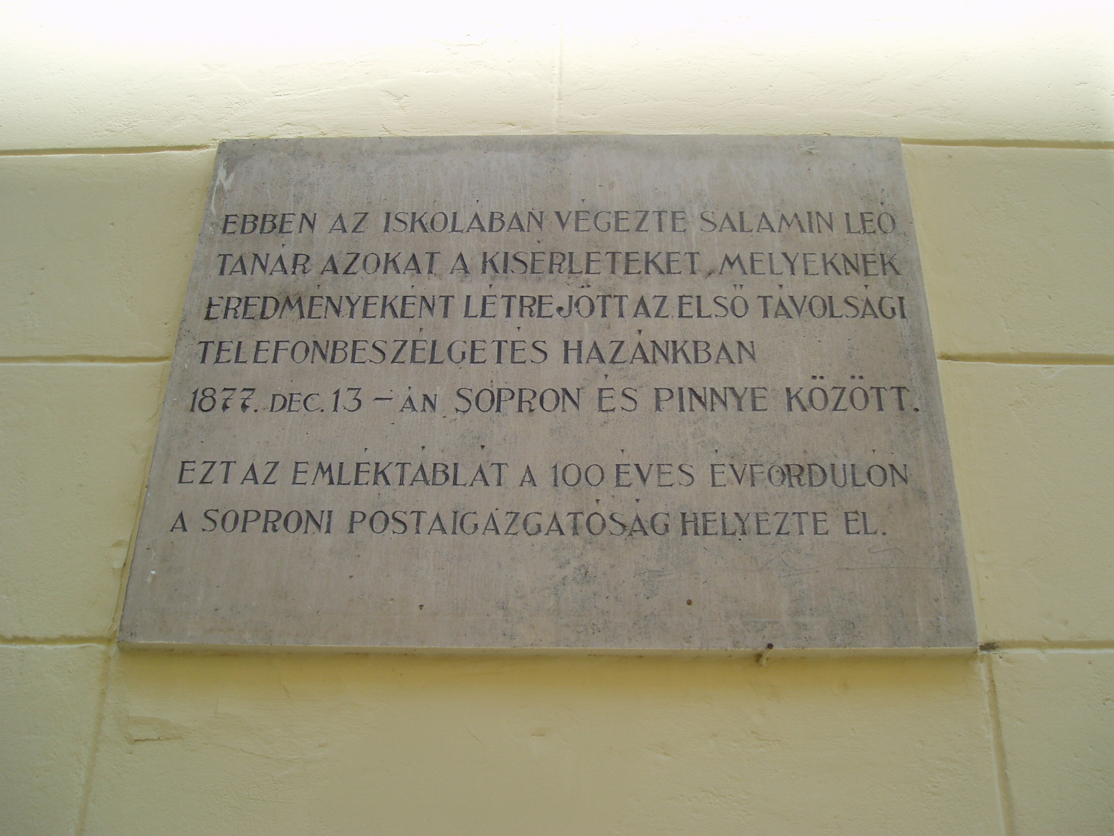 Nyilvános 1081 | 1429 | Sopron, Liszt Ferenc utca 2. | A Széchenyi István Gimnázium eredetileg reáliskola volt, amelyet 1850-ben alapítottak. Az épületen a soproni Postaigazgatóság által elhelyezett emléktábla megörökíti, hogy ebben az iskolában végezte Salamin Leó tanár azokat a kísérleteket, melyeknek eredményeként létrejött az első távolsági telefonbeszélgetés hazánkban 1877. december 13-án Sopron és Pinnye között. A kép 2008 júniusában készült. |
