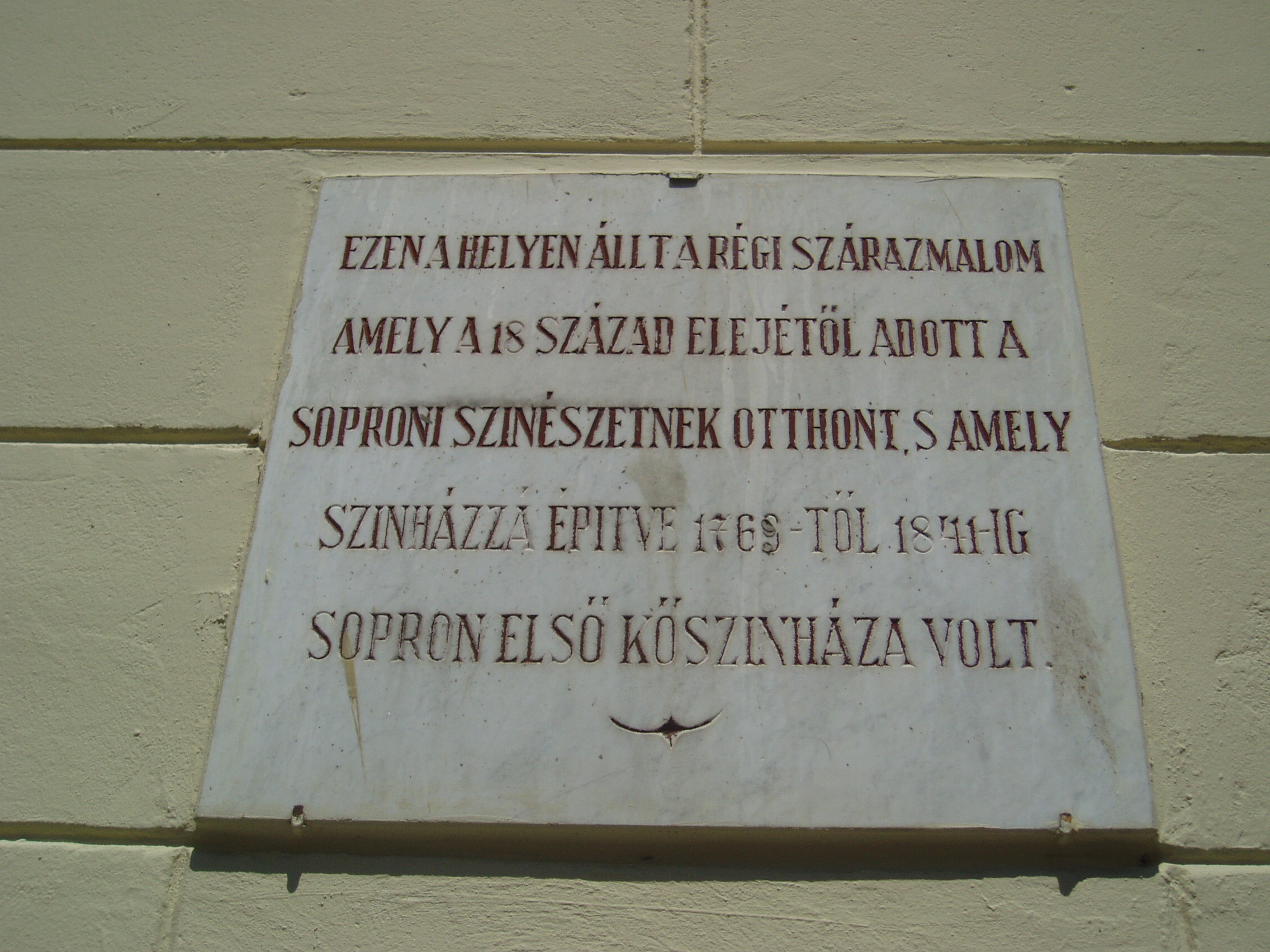 Nyilvános 1054 | 1337 | Sopron, Liszt Ferenc utca 2. | A Széchenyi István Gimnázium épületrésze helyén állott egykor Magyarország második legrégibb, egy szárazmalomból átalakított kőszínháza, amint erről a homlokzaton lévő emléktábla is tudósít. Az egykori szárazmalomban már 1754-től rendszeresen voltak előadások. Különösen említésre méltóak Felix Berner gyermektársulatának vendégszereplései 1768 és 1786 között, akik prózai színdarabok mellett baletteket és "zenés énekes játékok"-at is előadtak. Az épületből 1769-ben Trost György építész vezetésével igazi színházépületet alakítottak ki. Itt kezdte pályáját 1810–14 között Ferdinand Raimund (1790–1836), aki soproni évei után lett Bécs ünnepelt színésze és drámaírója. 1820 nyarán a csak lassan tért hódító magyar színtársulatok egyikének, Kilényi György színészcsapatának tagjaként játszott itt Déryné Széppataki Róza is. Miután 1840–41-ben Sopron városa felépítette új színházépületét, az egykori szárazmalomból lett színházat 1847-ben lebontották. A fénykép 2008 júniusában készült. Felh. irod.: Csatkai Endre: Sopron és környéke műemlékei. Bp. Akadémiai Kiadó, 1956 /Magyarország műemléki topográfiája 2./ Czellár Katalin: Sopron. 3. jav. kiad. Bp. Panoráma, 2000 |