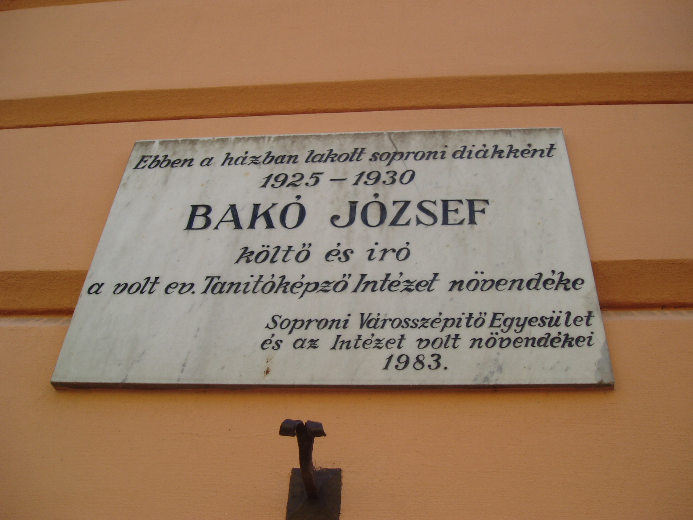 Nyilvános 1087 | 1676 | Sopron, Móricz Zsigmond utca 8. | Az emeletes épületen 1983-ban elhelyezett emléktábla tanúsága szerint soproni diákként ebben a házban lakott 1925 és 1930 között Bakó József költő és író, a volt evangélikus tanítóképző intézet növendéke. Bakó József (Nemescsó, 1896. aug. 24. - Bp., 1962. ápr. 7.): költő, elbeszélő. Zsellércsaládból származott, Másfél évtizedig cipész volt. A Tanácsköztársaság bukása után hét hónapi fogházbüntetést kapott. Utána sokat hányódott, amíg elvégezte a tanítóképzőt. Több helyen tanított, nyaranta bebarangolta egész Európát. A felszabadulás után dolgozott a vallás- és közoktatásügyi minisztériumban, a Köznevelés szerkesztőségében, valamint több könyvtárban, legutóbb az Országgyűlési Könyvtárban. Írásai már az 1920-as évek elejétől megjelentek a Népszavában, a Nyugatban, a Pesti Naplóban. Verseiben a paraszti élet nyomorát szólaltatta meg erőteljes realizmussal, hangja később forradalmibb, a felszabadulás után a megváltozott életről rajzolt képet. Prózai műveiben is a falusi élettel foglalkozott. A fénykép 2008 júniusában készült. Felh. irod.: http://www.netlexikon.hu/yrk/Ryrgenwm/613 |
