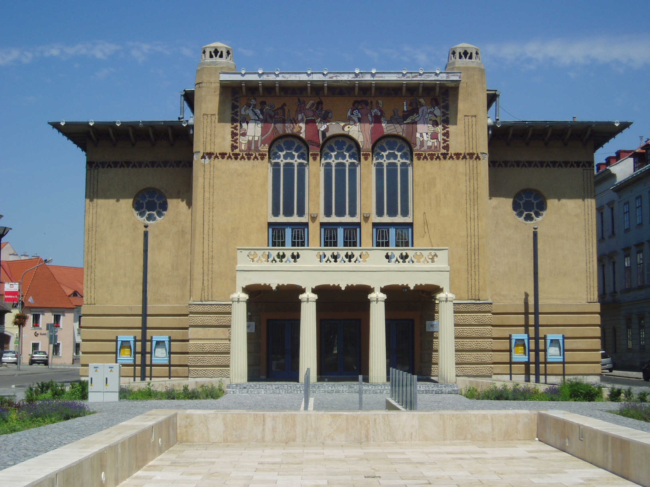Nyilvános 1062 | 1749 | Sopron, Petőfi tér 1. Petőfi Színház | A szecessziós stílusú színház a korábbi épület átalakításával készült Medgyaszay Ferenc tervei alapján. A főhomlokzat nagy sgrafitto képét ifj. Storno Ferenc tervezte. Az erkélyt a régi színház dór oszlopai tartják. A soproni állandó színház léte 1769-ig nyúlik vissza. Egy szárazmalmot alakítottak át ekkor színházzá (lásd: Liszt F. utca 2.), ahol már komoly, bár még elsősorban német nyelvű színházi élet folyt. Ennek közelében, a színház jelenlegi helyén a város 1840-ben emelt új színházépületet, amelynek terveit Franz Lössl, Bécsben tanult építész készítette empire stílusban. Ifjúkorában három évig itt volt karmester Franz von Suppé (1819–1895). Ide szerződött tizennyolc évesen, 1848 októberében Goldmark Károly prímhegedűsnek. Járt a színház épületében mint néző Liszt Ferenc utolsó soproni hangversenye (lásd: Sopron, Széchenyi tér 15.) előestéjén, 1881. április 5-én. A soproni kőszínház 1909-ig működött. Ekkor tűzveszélyessége miatt csaknem teljesen lebontották, csak főfalai és bejáratának dór oszlopai maradtak meg. 1937. október 4-én itt mutatta be a soproni Katolikus Akció Műkedvelői Társulata Kálmán Imre: Csárdáskirálynő című operettjét a szerző jelenlétében, aki műve nyitányát maga vezényelte, majd a díszpáholyból nézte végig az előadást. 1939. május 13-án itt volt az első Éneklő Ifjúság hangverseny, előtte Bárdos Lajos tartott bevezetőt. 1940. május 12-én Kodály Zoltán látogatott Sopronba, aki részt vett és vezényelt is a színházban megtartott Éneklő Ifjúság hangversenyen. Az épületet 1950-ben államosították, s 1969–1975 között nem túl szerencsésen újították fel. A rendszerváltás után lett önálló színtársulata, s az ekkor elvégzett felújítás visszaadta az épületnek a Medgyaszay által tervezett eredeti, azóta már polgárjogot nyert szecessziós vonásokat. A kép 2008 júniusában készült. Felh. irod.: Czellár Katalin: Sopron. 3. jav. kiad. Bp. Panoráma, 2000 Csatkai Endre: Sopron és környéke műemlékei. Bp. Akadémiai Kiadó, 1956 /Magyarország műemléki topográfiája 2./ Hiller István: Kálmán Imre (1882–1953) soproni kapcsolatai. = Soproni Szemle 1982. 1. Nagy Alpár: Kodály Zoltán és Sopron. = Soproni Szemle 1971. 1. |