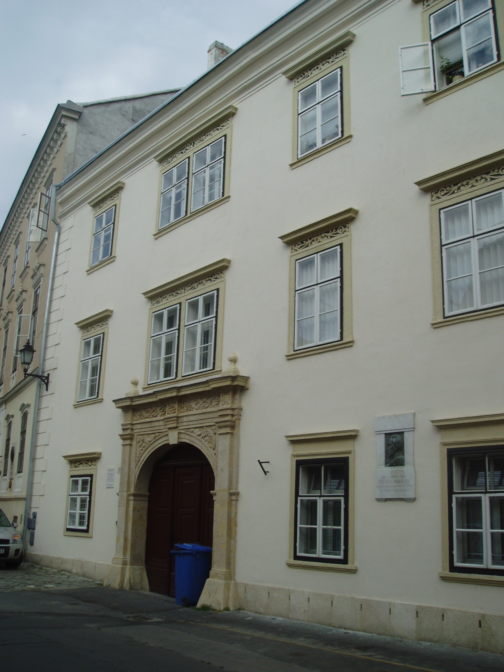 Nyilvános 1011 | 1670 | Sopron, Szent György utca 22. Sax-ház | A középkori eredetű, kétemeletes lakóház késő reneszánsz homlokzata a XVIII. század második feléből származik. Tulajdonosai főként patríciusok, főurak, katonatisztek voltak. 1800 körül itt lakott Révay Miklós, a neves nyelvész. Ezt a tényt domborműves emléktábla is megörökíti. A kép 2008 júniusában készült. Felh. irod.: Czellár Katalin: Sopron. 3. jav. kiad. Bp. Panoráma, 2000 |