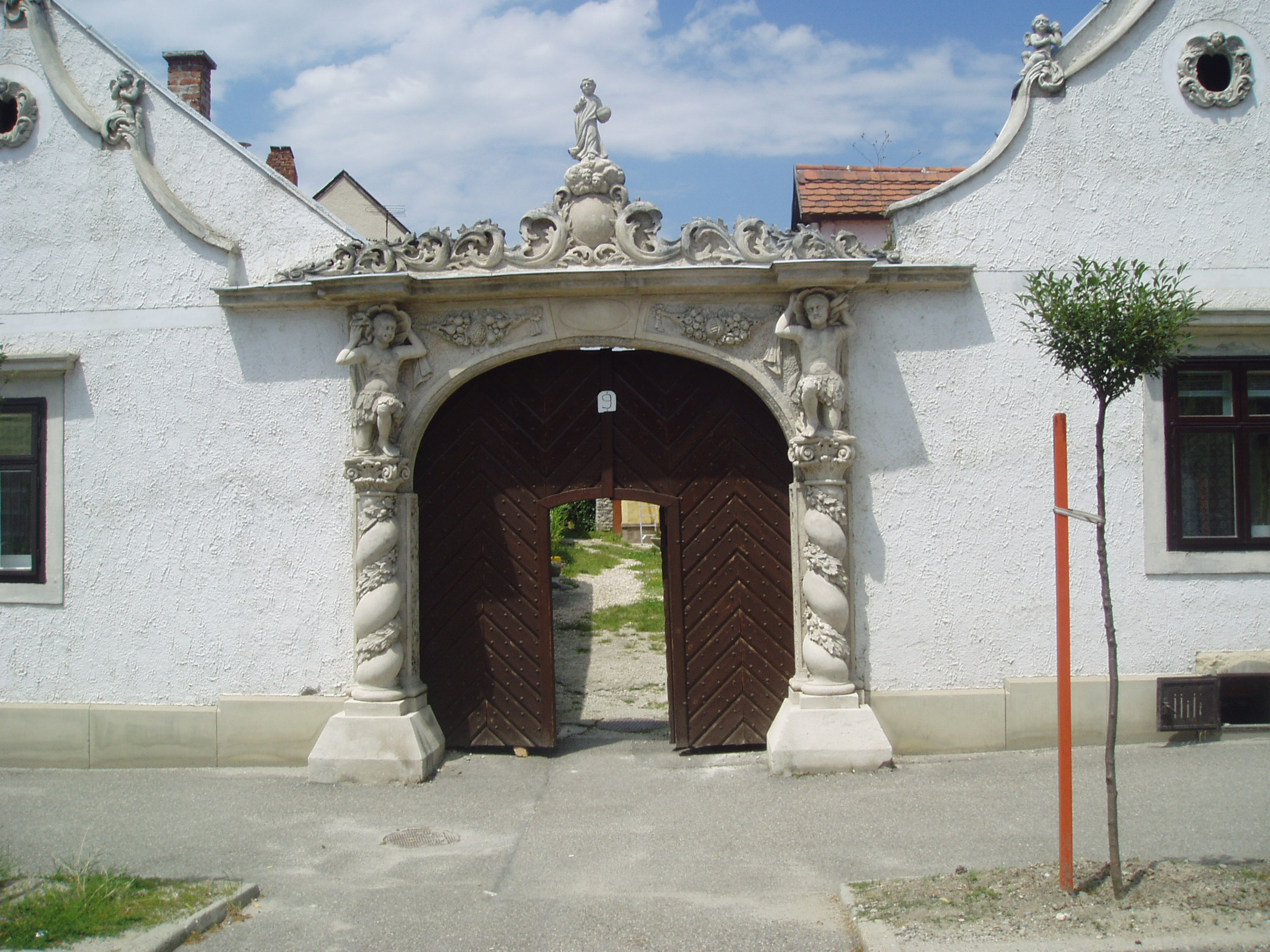 Nyilvános 1058 | 1547 | Sopron, Szent Mihály utca 9. Két mór-ház | Az épület két XVII. századi, oromzatos parasztházból alakult ki az 1700-as évek elején. Ekkor Leitner Szervác szobrász volt a tulajdonosa, aki népies barokk stílusban gazdagon díszítette a homlokzatot. A két házat mozgalmas díszítésű kapu köti össze, melyet két korinthoszi csavart oszlop keretez, a tetején egy-egy mór alakjával. Az oromzatok közepén dús keretezésű fülkében Mária, illetve Szent József szobra áll.A fülkék mellett két kis kerek ablak van, gazdag keretezéssel. Az oromzatok hullámos széleit angyalkák díszítik, csúcsukon Szent Flórián és Szent Rókus feje látható. A kép 2008 júniusában készült. Felh. irod.: Czellár Katalin: Sopron. 3. jav. kiad. Bp. Panoráma, 2000 |