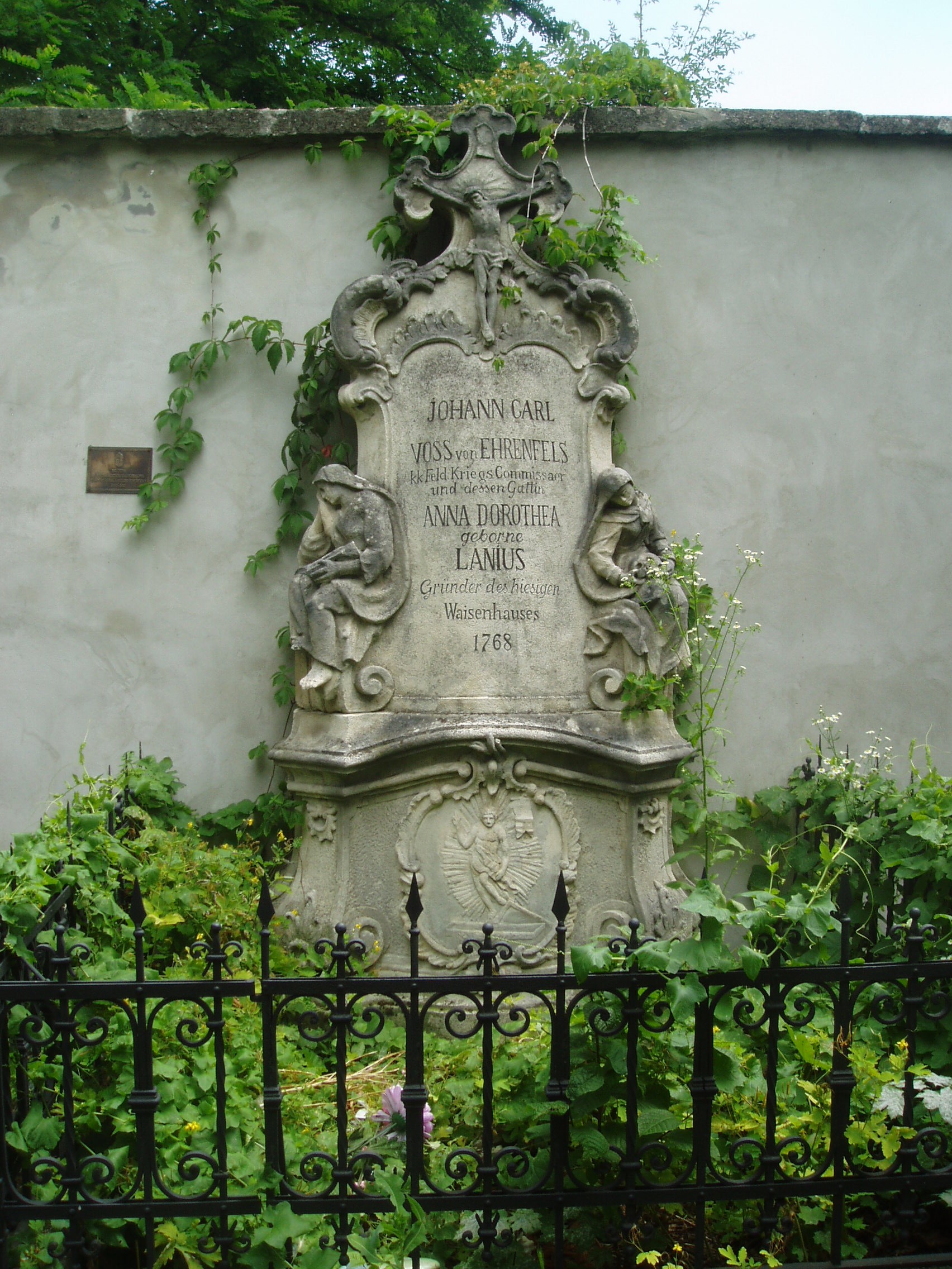 Nyilvános 1039 | 1384 | Sopron, Szent Mihály utca: Szent Mihály-templom udvara | A Szent Mihály-templom körül egykor temető volt, várfallal körülvéve. Síremlékei közül néhány megmaradt. A képen a Voss-házaspáré látható 1768-ból. A kép 2008 júniusában készült. Felh. irod.: Czellár Katalin: Sopron. 3. jav. kiad. Bp. Panoráma, 2000 |