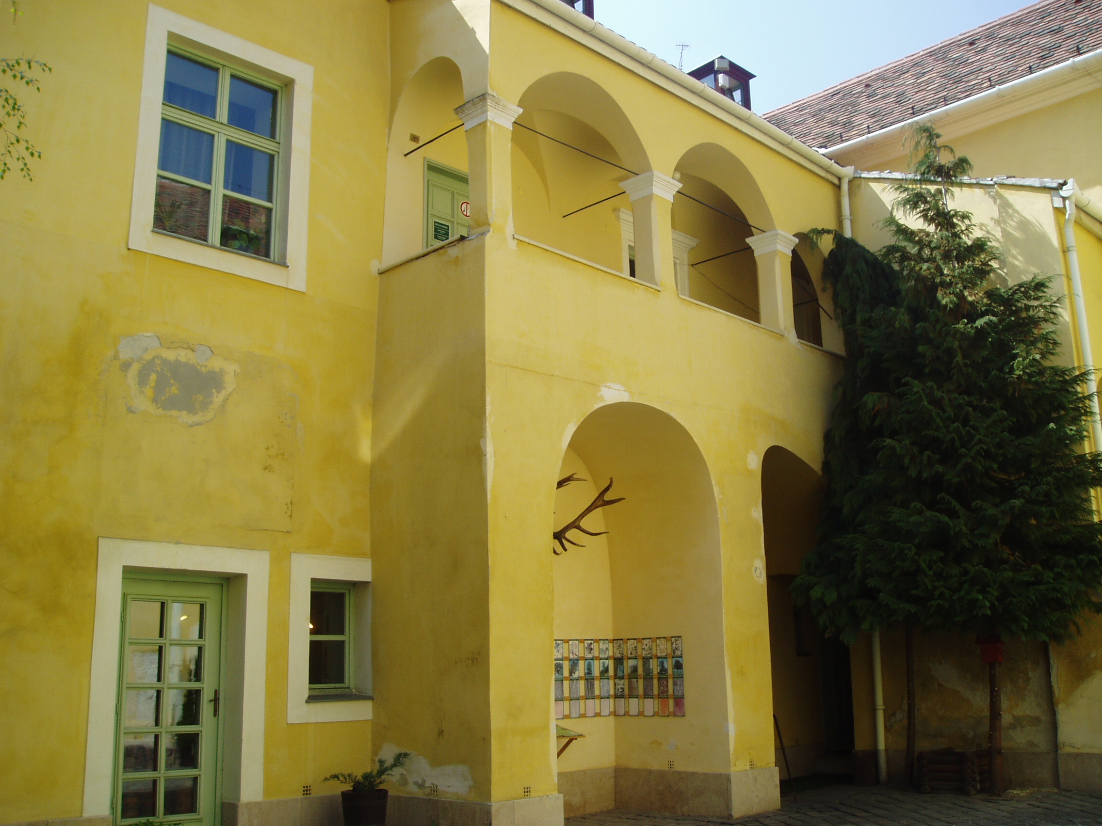 Nyilvános 1025 | 1365 | Sopron, Templom utca 4. Esterházy-palota | A Templom utca 2. számú házhoz hasonlóan ez a középkori eredetű épület is az Esterházy család tulajdona volt 1614-től egészen 1945-ig, előtte pedig Oláh Miklós, a neves humanista érsek családjáé volt. A XVII. századból a kapu és az udvari loggia őrződött meg; homlokzata, amely mintegy folytatása a másik Esterházy–palotának, a XVIII. század közepéről származik. Ebben az épületben állapították meg 1921-ben az antanthatalmak megbízottjai a Sopron és környékének sorsát eldöntő népszavazás eredményét. Az evangélikus templom harangozója hallotta meg elsőként a polgárok közül a jó hírt, s ő kezdte el örömében a harangozást, amihez azután Sopron többi temploma is csatlakozott. A kép 2008 júniusában készült. Felh. irod.: Czellár Katalin: Sopron. 3. jav. kiad. Bp. Panoráma, 2000 |