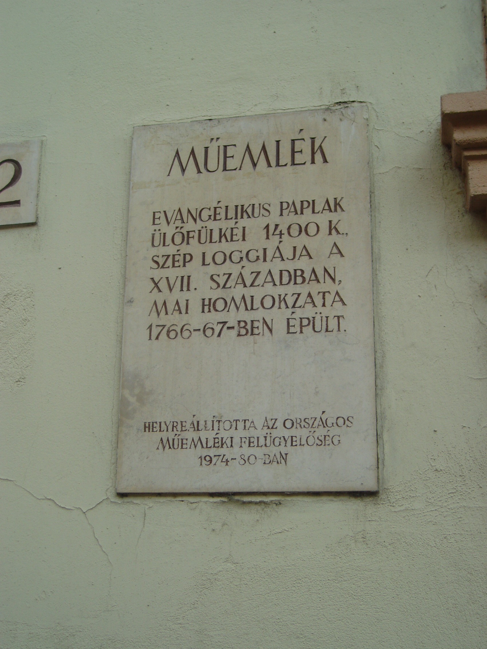 Nyilvános 1026 | 1345 | Sopron, Templom utca 12. | Az eredetileg egyemeletes középkori lakóházra a XVII. századi késő reneszánsz, kora barokk átépítése során került a bejárati kapu felett félkörívesen kidomborodó zárt erkély, és ebből az időből kelteződik az udvari front kialakítása is. 1770 körül építették rá a második emeletet, amikor a Lassberg grófi család birtokába került. Az első emeleti nagyteremben ekkor városszerte híres bálokat rendeztek. 1866-ban vette meg az evangélikus konvent az épületet paplak céljaira, és azóta is az evangélikus egyház tulajdona. Dongaboltozatos, hosszú kapubejárójában a két oldalt kőráccsal díszített gótikus ülőfülkesor 1400 körül készült. A középkori eredetű épület 1866-ban került az evangélikus egyház tulajdonába, előbb paplakként hasznosították, majd ez lett Evangélikus Országos Múzeum soproni kiállítóhelye. A kép 2008 júniusában készült. Felh. irod.: Czellár Katalin: Sopron. 3. jav. kiad. Bp. Panoráma, 2000 |