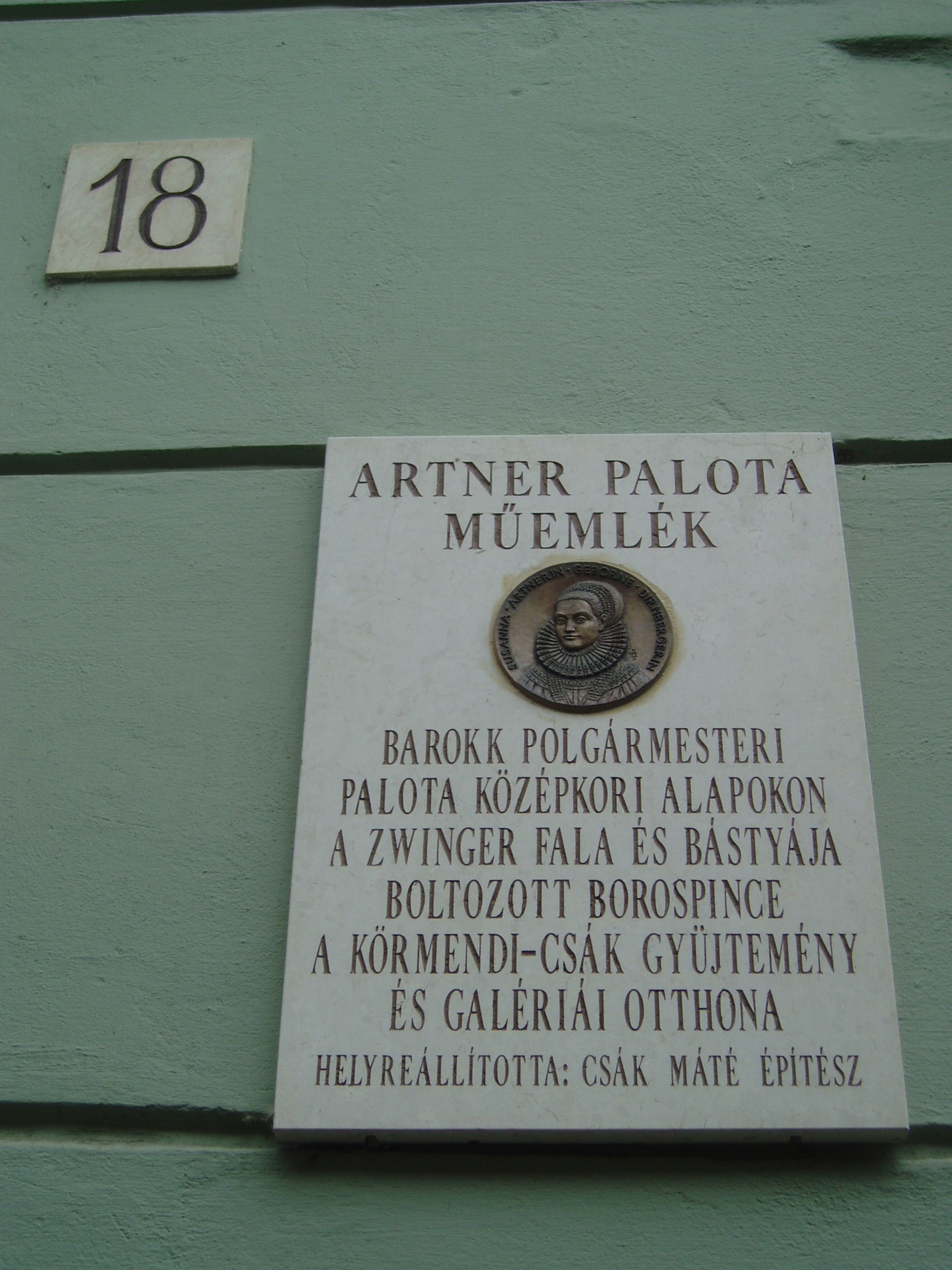 Nyilvános 1019 | 1377 | Sopron, Templom utca 18. Artner-palota | Az egyemeletes barokk lakóház első ismert tulajdonosa Artner Vilmos volt. A kapu fölötti címeren az ő neve és az 1723-as évszám olvasható. A kép 2008 júniusában készült. Felh. irod.: Czellár Katalin: Sopron. 3. jav. kiad. Bp. Panoráma, 2000 |