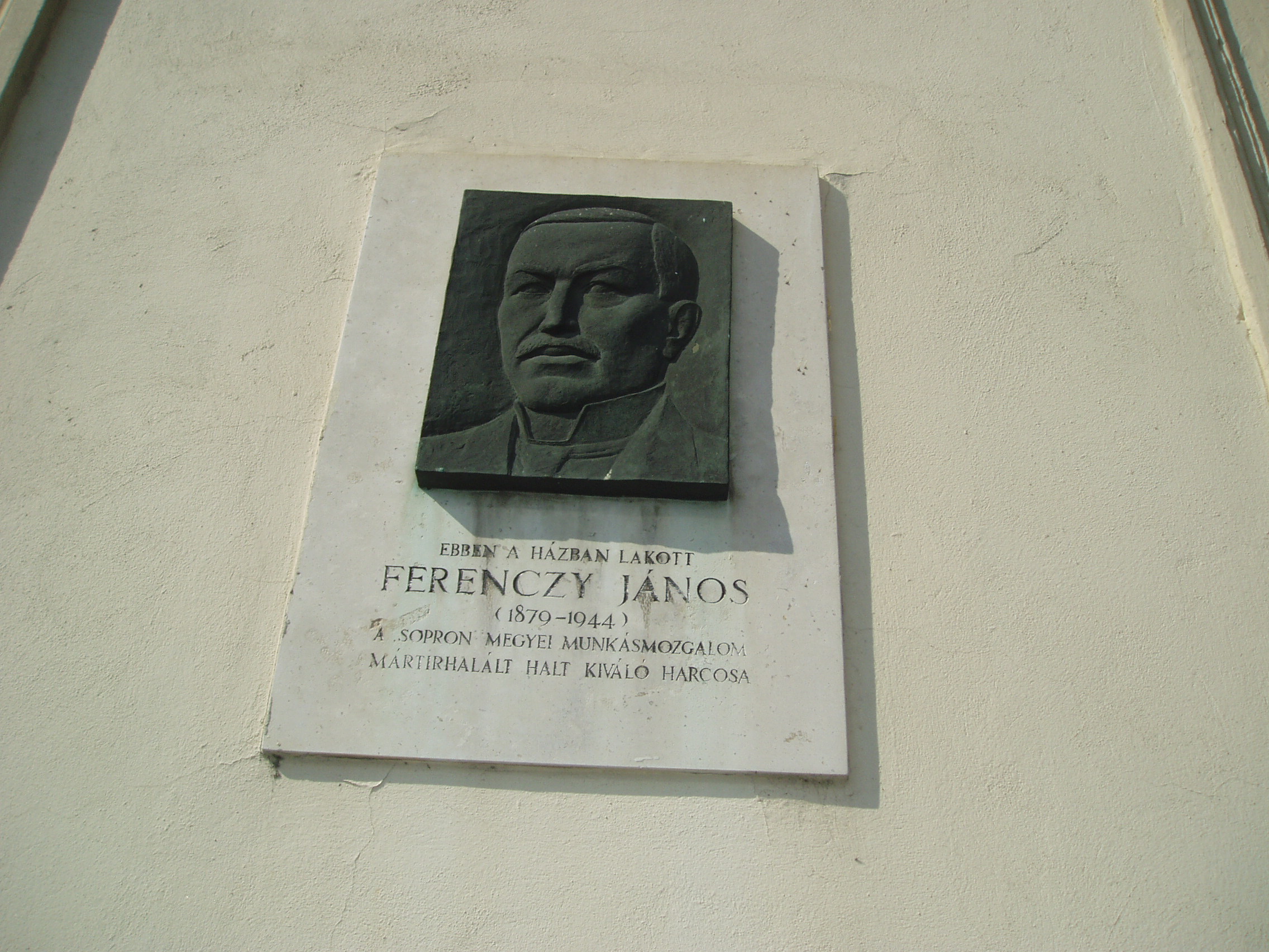 Nyilvános 1042 | 1381 | Sopron, Újteleki utca 54. | Az épületen domborműves tábla idézi Ferenczy János (1870-1944) alakját. Egykor ebben a házban lakott a sopron megyei munkásmozgalom mártírhalált halt kiváló harcosa. A kép 2008 júniusában készült. |