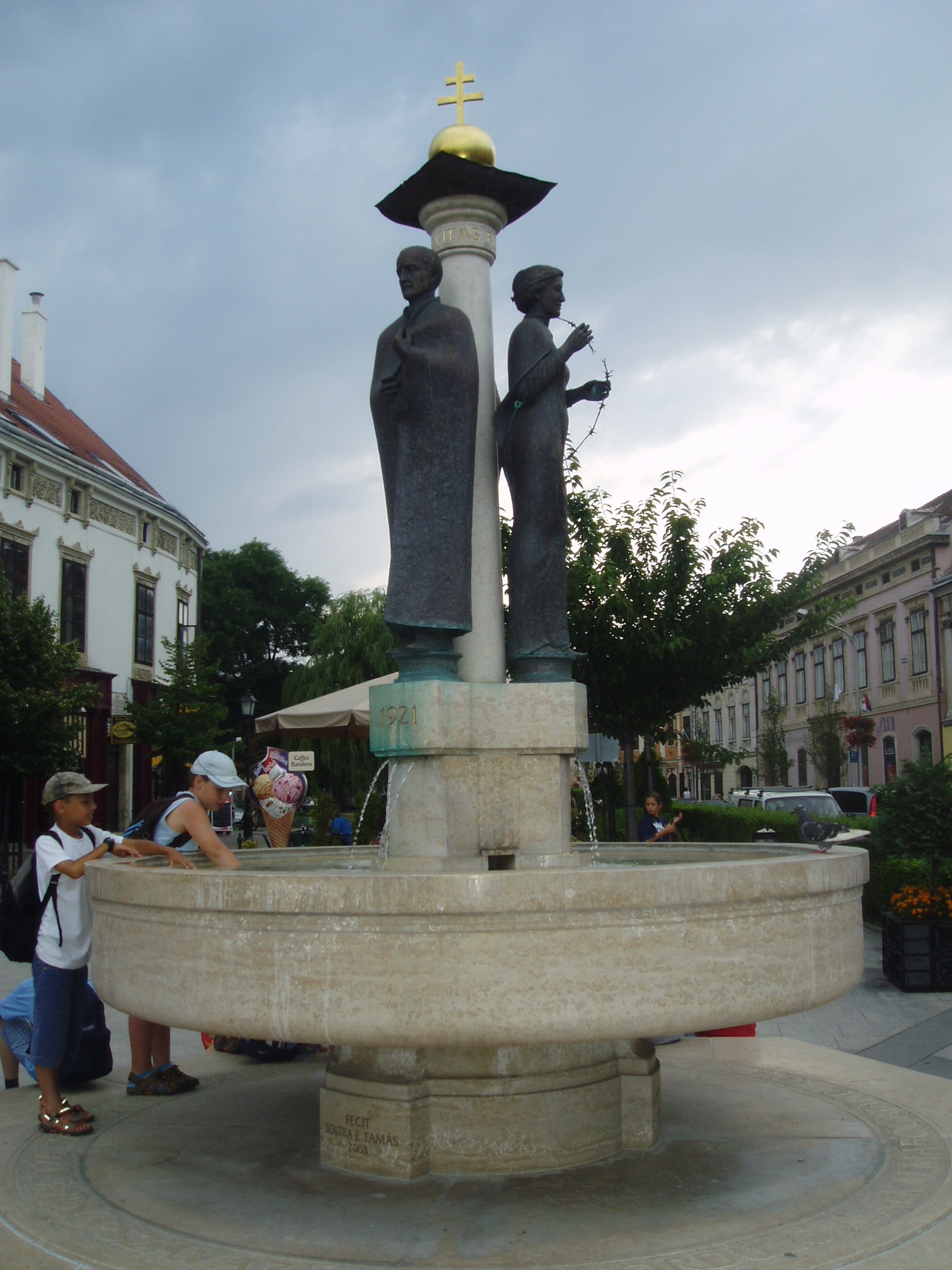 Nyilvános 1054 | 3491 | Sopron, Várkerület 30. előtt: Hűségkút | Soltra E. Tamás szobrászművész és Fekete Szilárd építész alkotása a 2003-ban felavatott Hűségkút. Három figurája az 1277-es történéseknek, amelyek eredményeként Sopron IV. László királytól szabad királyi város rangot kapott, az 1921-es népszavazásnak és az 1989-es Páneurópai Pikniknek állít emléket. A kép 2008 júniusában készült. |