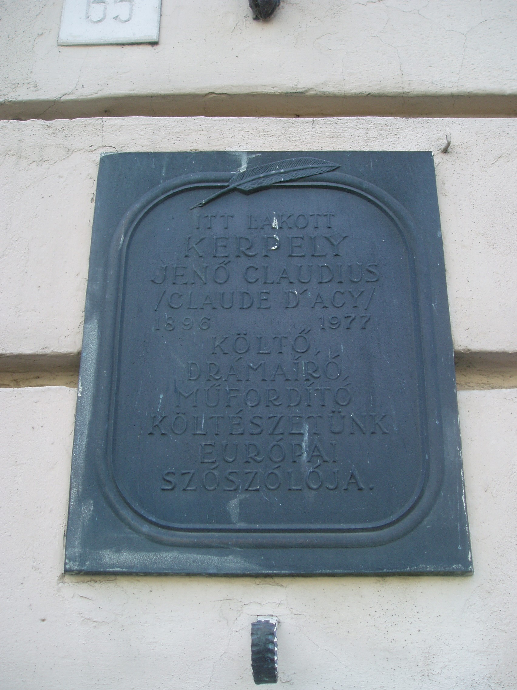 Nyilvános 996 | 1378 | Sopron, Várkerület 65. | A kétemeletes városi palota homlokzatán olvasható emléktábla szerint itt lakott a soproni születésű Kerpely Jenő (1896-1977) költő, drámaíró, műfordító, újságíró. Budapesten, Bécsben és New Yorkban jogi tanulmányokat végzett. Ügyvédként és irodalmi jogképviseleti iroda vezetőjeként dolgozott Budapesten. Verseket, színműveket írt, német versfordításokat közölt osztrák, svájci és német lapokban. A Pester Lloydban külpolitikai cikkei jelentek meg. Thomas Mann ösztönzésére távozott a negyvenes évek végén Bécsbe. Ott folytatta műfordítói tevékenységét, számos magyar irodalmi művet fordított le németre, magyar költői antológiát adott ki. Német nyelvű műveit Eugen K. Claudius néven jelentette meg. A Claude d'Acy írói nevet is használta. Mindvégig az osztrák fővárosban élt, a végén eléggé visszavonultan. Magyar és német nyelven több könyve jelent meg a harmincas és negyvenes években. Felh. irod.: Borbándi Gyula: Nyugati magyar irodalmi lexikon és bibliográfia. Bp. Hitel, 1992 |