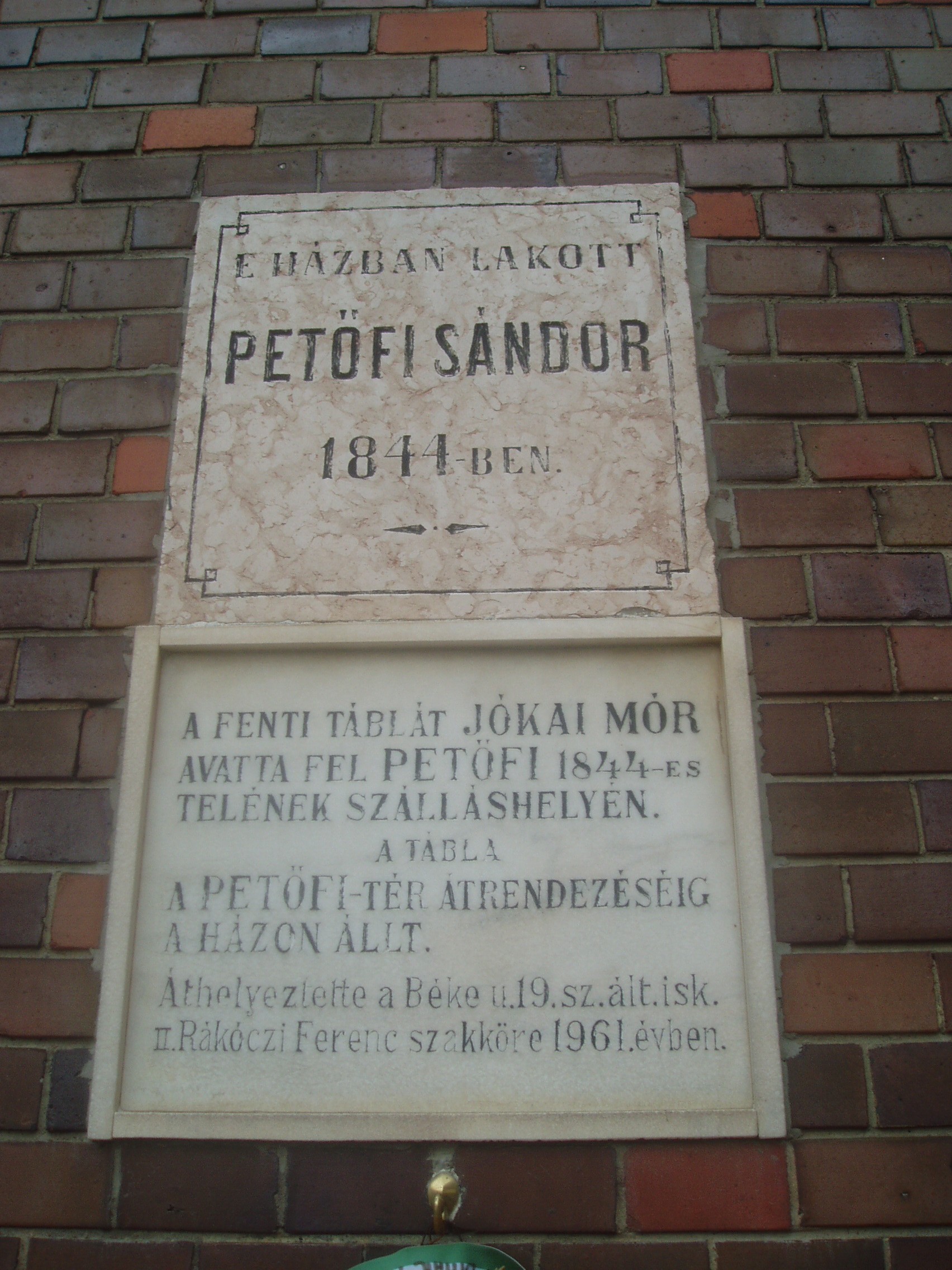 Nyilvános 1156 | 2299 | Debrecen, Petőfi tér 12. Vasútállomás | A vasútállomás város felőli oldalának szárnyépületén helyezték el újra Petőfi Sándor Jókai Mór által felavatott emléktábláját. Az emléktábla eredetileg azt a körülbelül ezen a helyen állott kis házat jelölte, amelyikben Petőfi Sándor 1843-44 fordulóján élete legcudarabb telét töltötte Fogas Józsefné színházi jegyszedő lakásán. Az idős asszony gondozta, főzött, mosott rá. "Ha nem tette volna - írta egyik levelében a költő -, most e levelet a másviágról írnám." Ha fázós kezével megkaparta jégvirágos ablakát, tekintete a temetőre és a debreceni akasztófára esett. Temetésre szól az ének, Temetőbe kit kísérnek? Akárki! már nem földi rab, Nálam százszorta boldogabb. - írta egy versében. De itt írta a következő sorokat is: Tied vagyok, tied, hazám! E szív, e lélek; Kit szeretnék, ha tégedet Nem szeretnélek? A kis házat száz év múlva amerikai szőnyegbombázás pusztította el. Az állomás előtti parkban Medgyessy Ferenc egészalakos szobra is idézi a költő alakját. Felh. irod.: Papp Antal: Debrecen. Bp. Panoráma, 1976 Petőfi emlékhelyek a Kárpát-medencében. Kiskőrös, 1996 www.debrecen.hu |