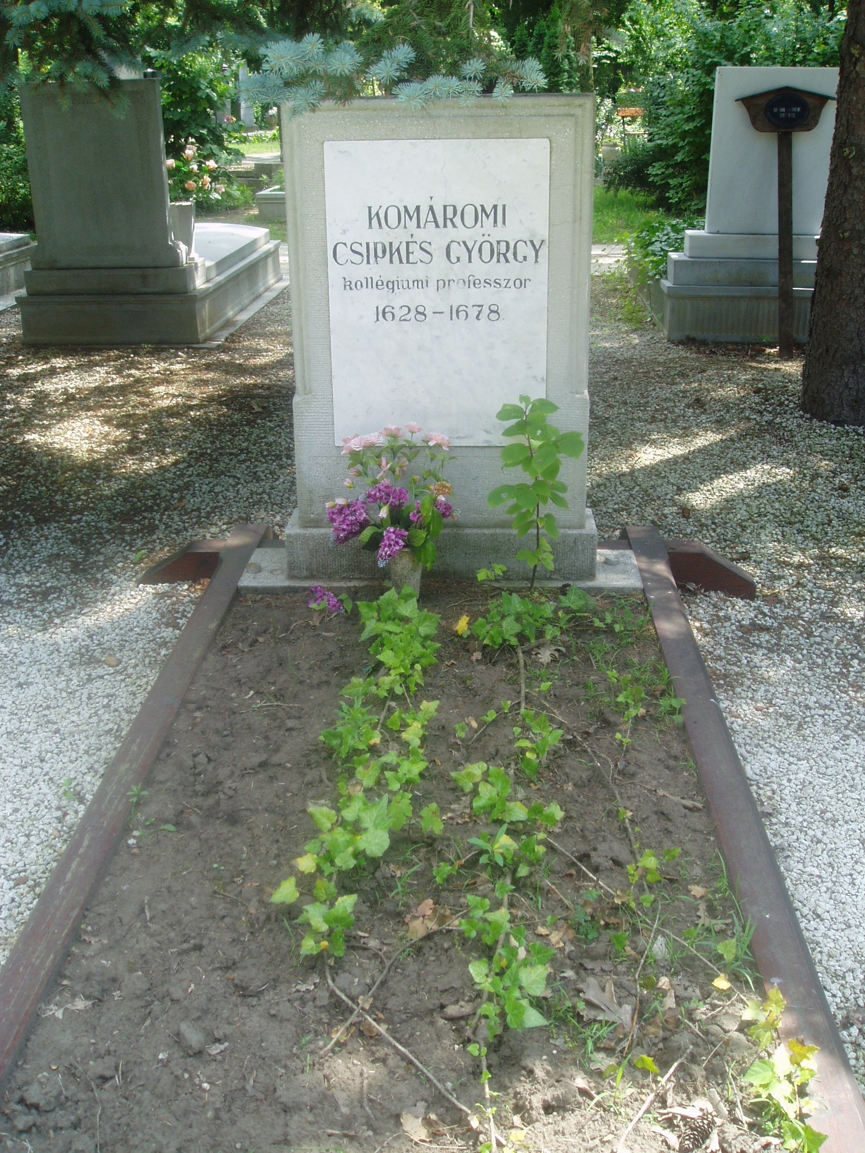 Nyilvános 1541 | 4442 | Debrecen, Bocskai út: Köztemető: Komáromi Csipkés György sírja | Debrecen új köztemetőjét 1932-36 között alakították ki. A temetőkertet és a nagy művészettörténeti értéket képviselő ravatalozó épületét Borsos József tervezte. A díszsírhelyek a főbejárattól jobbra helyezkednek el. Itt nyugszik a magyar művelődástörténet számos nagy alakja, akiknek földi maradványait áthozták a többnyire felszámolt régi temetőkből. A díszsírhelyek a főbejárattól jobbra helyezkednek el. A Református Kollégium (lásd: Debrecen, Kálvin tér) híres professzorai közül többen is itt nyugszanak, köztük Komáromi Csipkés György (Komárom, 1628. - Debrecen, 1678. október 6.), a magyar barokk teológiai irodalom képviselője, a teológia doktora. Az utrechti egyetemen keleti nyelveket tanult, s doktori fokozatát is ott nyerte el. 1653-ban lett Debrecenben a keleti nyelvek és bölcselet tanára. 1657-ben lelkésszé választották, hivatalát 1678. okt. 6-án bekövetkezett haláláig viselte. Könyveit a debreceni és sárospataki iskolának hagyta. Szobra a Nagyerdőben, az Egyetem téren látható. A fénykép 2006 júniusában készült. Felh. irod.: Kovács Gergelyné: Debrecen. Bp. Panoráma, 1981 www.lutheran.hu:8080/honlapok/protestans/felvidek/komarom |
