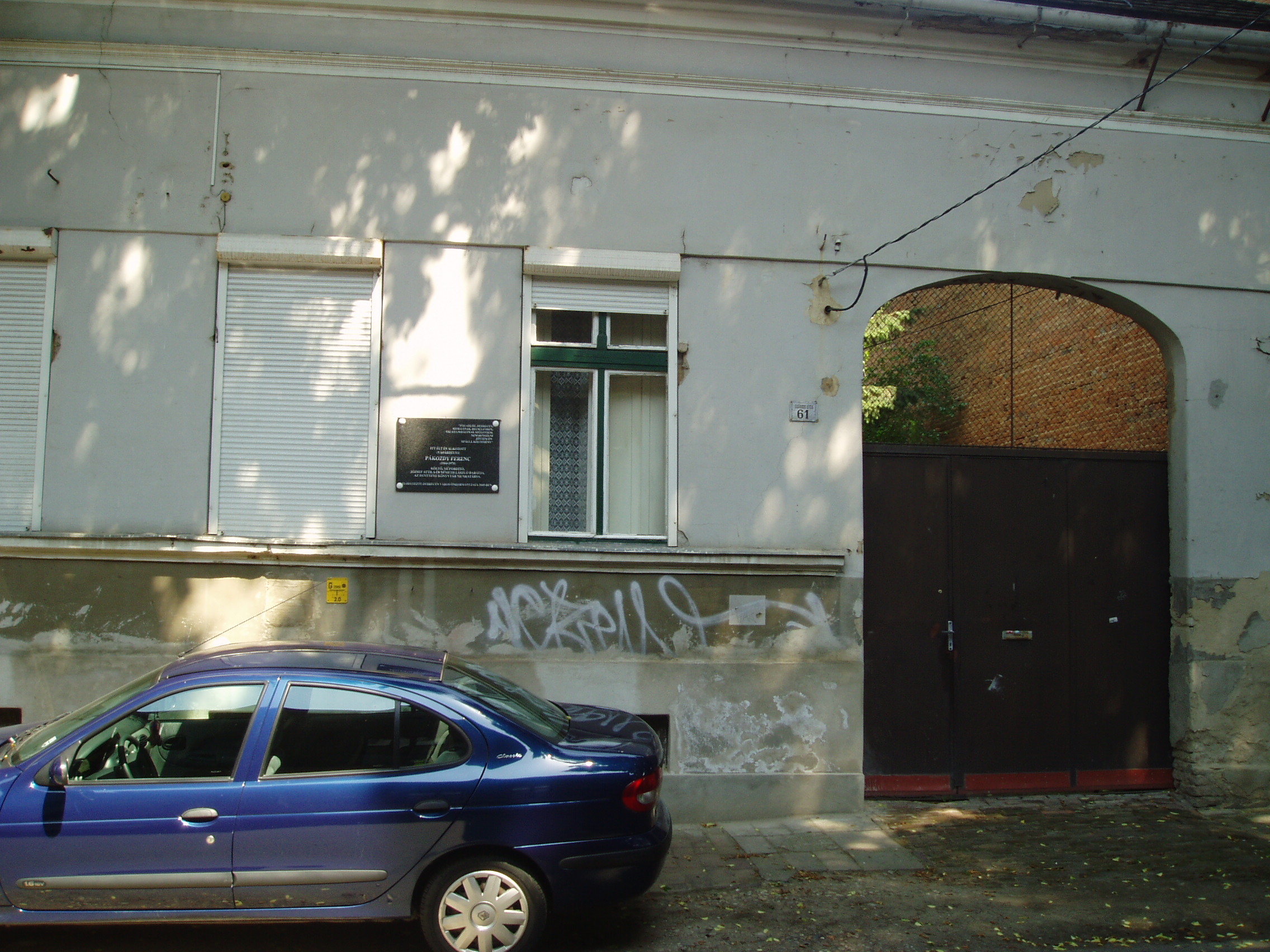 Nyilvános 1167 | 1672 | Debrecen, Darabos utca 61. | Mint az épületen elhelyezett fekete márványtáblán olvasható, ebben a házban élt és alkotott Pákozdy Ferenc (1904-1970) költő, műfordító, az Egyetemi Könyvtár munkatársa. Orvosnak készült, majd jogot hallgatott, jog- és államtudományi doktorátust szerzett. 1928–1944 között újságíró volt különböző lapoknál. 1945 után szülővárosában, Hódmezővásárhelyen dolgozott. 1952-től élt Debrecenben. A harmincas években József Attila pártfogója és értő kritikusa volt, költészete mellett a Külvárosi éj című verséről írott recenziójában állt ki (megjelent a hódmezővásárhelyi Hétfői Újságban 1933. jan. 2.án). A fénykép 2006 júniusában készült. Felh. irod.: Magyar életrajzi lexikon |