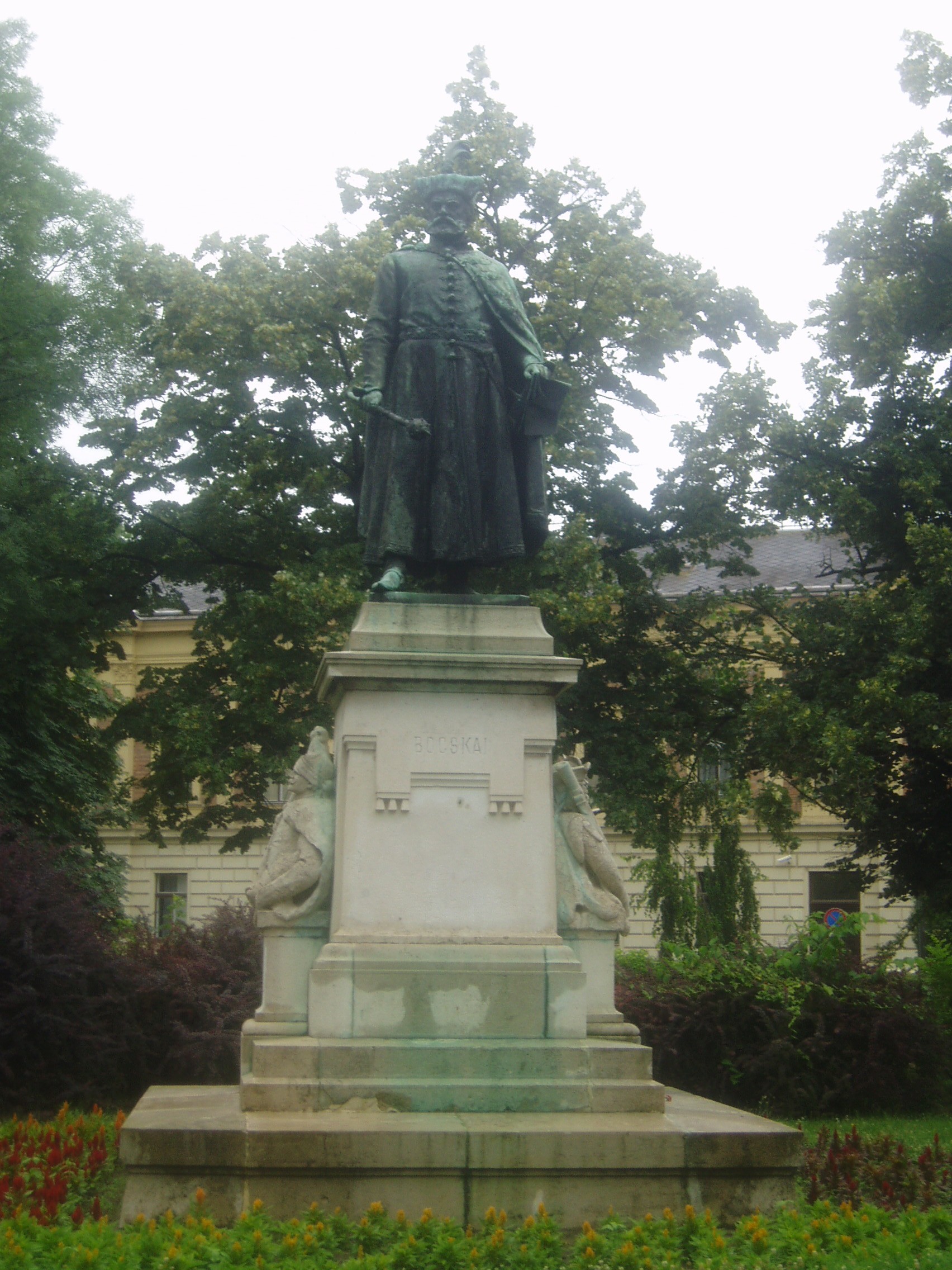 Nyilvános 1109 | 2149 | Debrecen, Emlékkert: Bocskai-szobor | A Nagytemplom és a Református Kollégium között húzódik az intim hangulatú Emlékkert. 1906-ban itt állították fel Holló Barnabás szobrának másolatát, amely Bocskai István erdélyi fejedelmet ábrázolja. Bocskai nagy pártfogója volt a hajdúságnak, letelepítésükkel megalapította a Hajdú-városokat. A fénykép 2006 júniusában készült. Papp Antal: Debrecen. Bp. Panoráma, 1976 Kovács Gergelyné: Debrecen. Bp. Panoráma, 1981 |