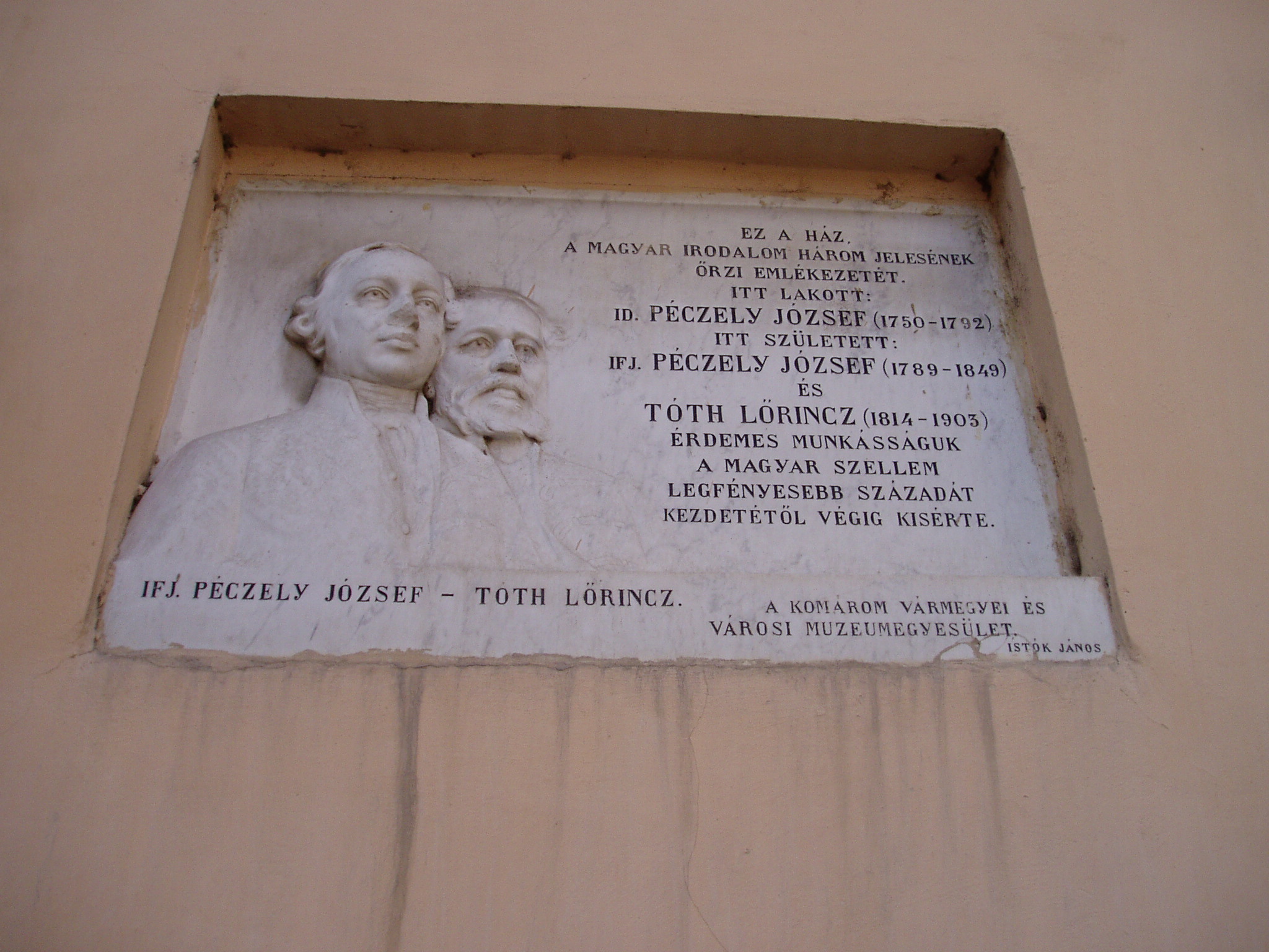 Nyilvános 1588 | 3833 | Komárom (Komárno), Ferences barátok u. 22. | Ez a ház volt a régi református lelkészlak. Itt lakott 1783-tól haláláig id. Péczeli József (1750-1792) költő, műfordító, aki 1789-ben megszervezte a Komáromi Tudós Társaságot, megalapította és szerkesztette az 1789 és 1792 között megjelenő első magyar tudományos-ismeretterjesztő folyóiratot, a Mindenes Gyűjteményt. Szintén ebben a házban lakott Mindszenthy Sámuel (1751-1806) író, lexikonkiadó, a Mindenes Gyűjtemény társszerkesztője. Ebben a házban született Péczely József fiaként ifj. Péczely József (1789-1849) tanár, történész, akadémikus, valamint Tóth János református lelkész fiaként Tóth Lőrinc (1814-1903) író, jogtudós, a Magyar Tudományos Akadémia tagja, ügyésze és pénztárosa. 1845-től a XX. század elejéig itt laktak a dunántúli református egyházkerületnek a tudományokban, az irodalomban és a közéletben is tevékeny püspökei: 1845-76 között Nagy Mihály (1788-1878) hittudós, több egyházi mű szerzője; 1878-1895-ben Pap Gábor (1827-1895) költő, országgyűlési képviselő, szenvedélyes könyv- és éremgyűjtő; 1895-től az 1900-as évek elejéig Antal Gábor, számos társadalmi, közgazdasági és bölcseleti értekezés szerzője. A ház homlokzatán a Komárom vármegyei és városi Muzeum-egyesület 1904-ben id. Péczeli Józsefre, ifj. Péczeli Józsefre és Tóth Lőrincre emlékeztető márványtáblát helyezett el, amelyet Istók János szobrászművész alkotott. A táblát 1945-ben eltávolították, s csak hosszú idő után, 1991-ben került vissza eredeti helyére. A fénykép 2005. júliusában készült. Felhasznált irodalom: Mácza Mihály: Komárom mevezetességei. Pozsony, Madách-Posonium, 2002 |
