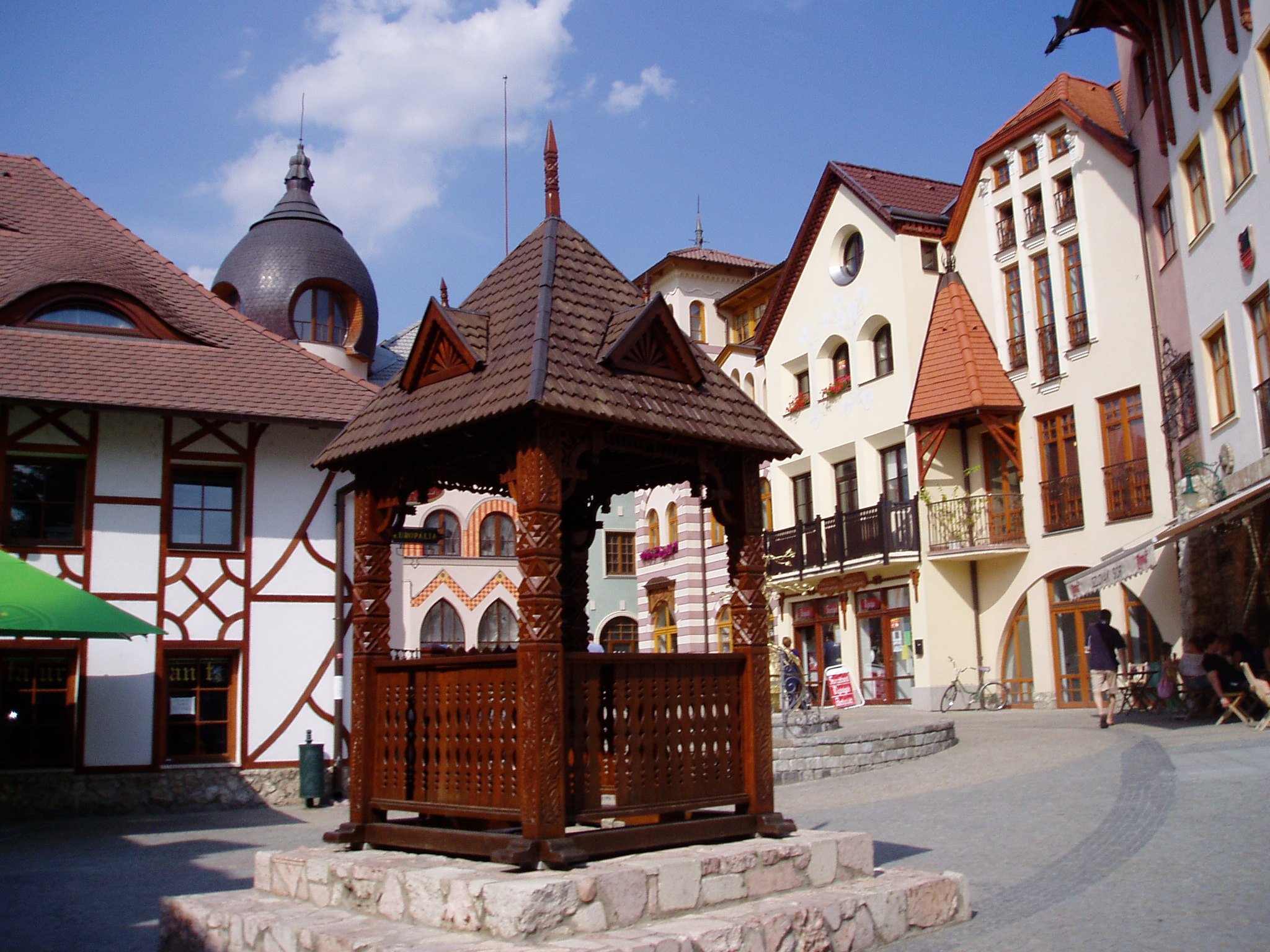 Nyilvános 1932 | 6691 | Komárom (Komárno), Európa udvar | A közelmúltban a Zichy–palota (lásd: Klapka tér 9.) udvarán építették ki az ún. Európa udvart. A helyi viszonylatban gigantikus méretű vállalkozás célja, hogy élőben mutassa be harmincöt európai ország építészetét. A városrész egyben Komárom új szolgáltató központja is, üzletekkel, éttermekkel, kávézókkal, valamint egy föld alatti bevásárlóközponttal. A fénykép 2005. júliusában készült. Felh.irod.: www.komarno.sk Mácza Mihály: Komárom nevezetességei. Pozsony, Madách-Posonium, 2002 |