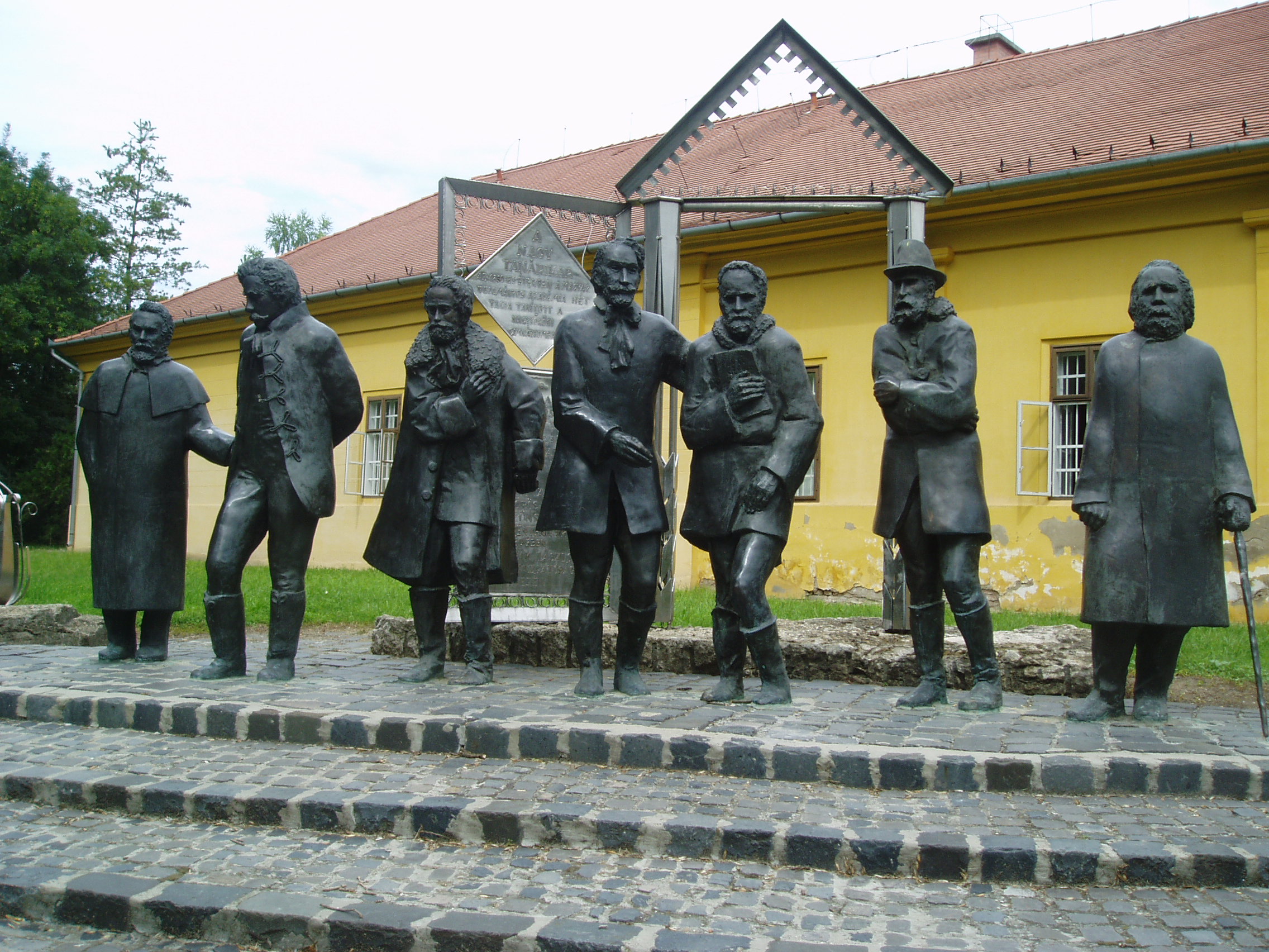 Nyilvános 1599 | 3621 | Nagykőrös, Ceglédi út 19. Arany János Múzeum. Varga Imre: Nagy tanári kar - szoborcsoport | Varga Imre: Nagy tanári kar című szoborcsoportját 1996. augusztus 20-án leplezték le az Arany János Múzeum épülete előtt. A szoborkompozíció a magyar kultúra azon kiemelkedő egyéniségeit örökíti meg, akik a Bach-korszakban a nagykőrösi gimnáziumban tanítottak, Nagykőrösön működtek. A legismertebb egyéniség, a nemzet halhatatlan költője, Arany János 1851-1860 között élt és alkotott Nagykőrösön. Mint ő írta egy levelében: a fél Akadémia Kőrösön van... A város történetének kiemelkedő egyéniségei továbbá Salamon Ferenc, Szilágyi Sándor történészek, Szabó Károly bibliográfus, Szász Károly költő, műfordító, református püspök, Szigethi Warga János neveléstörténész, Tomory Anasztáz matematikus és mecénás. A "Nagy tanári kar" működése Nagykőrös mezővárosi fejlődésének fénykorát reprezentálja. Ebben az időszakban Nagykőrös a magyar kultúra meghatározó központja volt, "magyar Weimar"-ként emlegették a várost, Arany Jánost pedig Goethe-hez hasonlították. Mindennek természetesen a politikai helyzet volt az oka: a szabadságharc utáni megtorlás időszakát átvészelt meghatározó értelmiségiek részben kiszorultak a Bach-korszak fővárosából, részben önként jöttek, mert egy kisvárosban szabadabban munkálkodhattak, s nagyon távolra mégsem kerültek Pesttől. A fénykép 2006 augusztusában készült. Felh. irod.: www.c3.hu/~pmiajm/hunnagyk.htm www.vendegvaro.hu Törös László: A nagykőrösi Arany emlékek katalógusa. = A nagykőrösi művelődés hármas kis tüköre. Nagykőrös, 1935 |