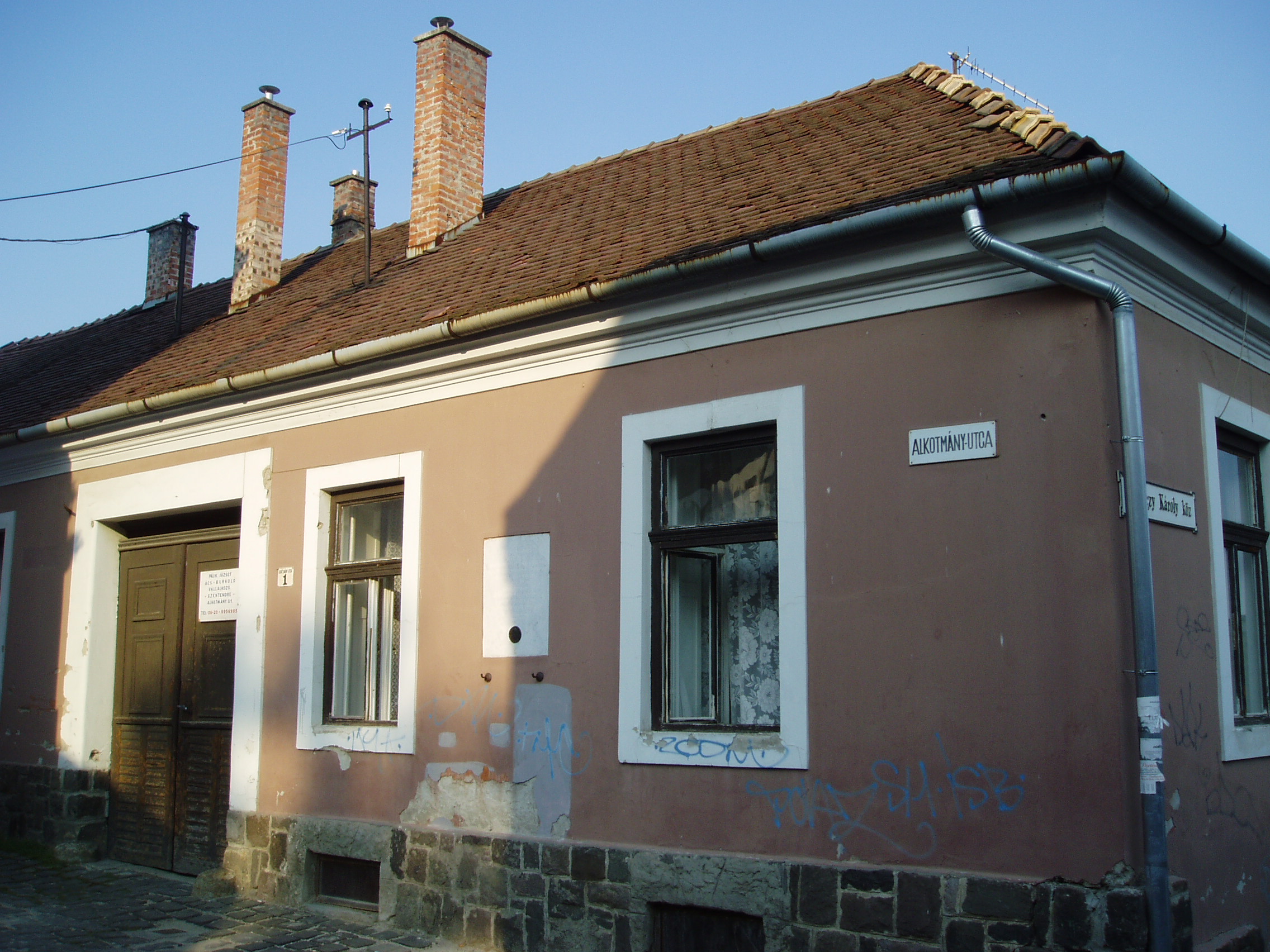 Nyilvános 1460 | 3375 | Szentendre, Alkotmány utca 1. | Ebben a házban élt 1889 és 1892 között Ferenczy Károly festőművész és felesége, Fialka Olga festőművész. 1890-ben itt születtek ikergyermekeik, akik mindketten halhatatlan alakjai a magyar képzőművészetnek: Ferenczy Béni szobrászművész és Ferenczy Noémi gobelinművész. A család legidősebb gyermeke, az 1885-ben született Ferenczy Valér is festőművész volt. A fénykép 2005 szeptemberében készült. |