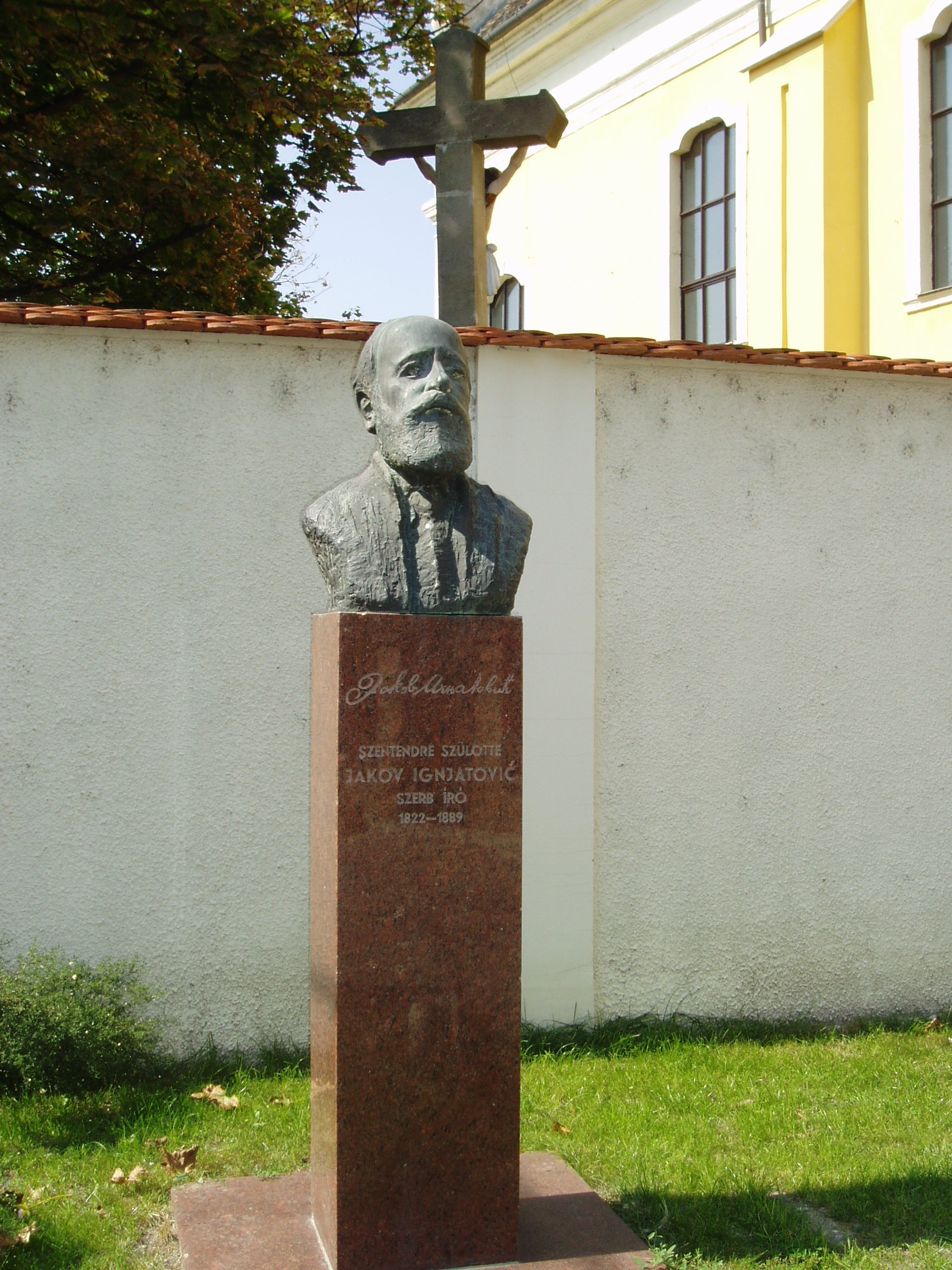 Nyilvános 1138 | 2181 | Szentendre, Ignatovity köz | A szülőháza (lásd: Szentendre, Dumtsa Jenő u. 5/A) melletti kis közt 1958-ban a neves szerb regényíróról, Ignatovity Jakobról nevezték el. Mellszobrát, Janzer Frigyes alkotását 1977-ben helyezték el itt, a Péter-Pál templom előtt. Ignatovity Jakob (1822-1889), a szerb realista regényírás megteremtője. A fiatalember Pesten jogot hallgatott és 1848. március 15-én a Nemzeti Múzeum előtti népgyűlésen a közös forradalom szónoka volt. Társadalmi regényei közül az Örök vőlegény és a Respektus Vásza címűek kötődnek Szentendréhez. Bennük ábrázolja korának és városának szerb nemzetiségű társadalmát. A fénykép 2005 szeptemberében készült. Felh. irod.: Szentendre. Szerk. Sándyné Wolf Katalin. Bp. Panoráma, 1985 |