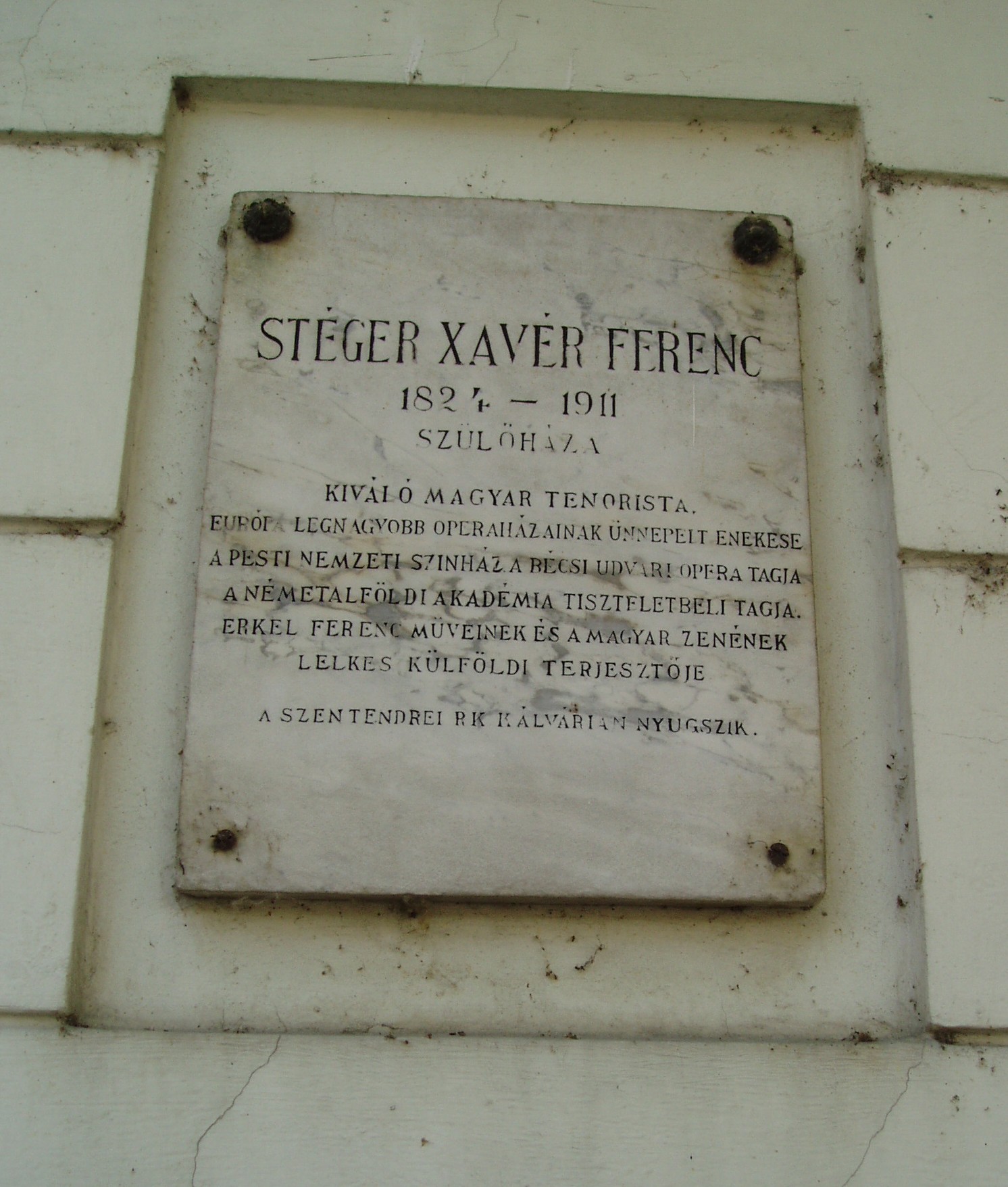 Nyilvános 1251 | 1944 | Szentendre, Dumtsa Jenő utca 10. | A XIX. zázadban épült polgárház 1978 óta a Barcsay Múzeum otthona. Barcsay Jenő (1900-) 1929-ben jött először Szentendrére, s azóta az év egy részét itt töltötte. Ezt írta a város szerepéről életében és művészetében: "Szentendrén éltem és Szentendrén alakítottam ki festészetemet, azt a valamit, amiért nekem érdemes volt küzdenem és élnem. A Szentendrén látott dolgokban, a természetben látott jelenségekben élet van, művészet van. Élnek azok a formák, színek, vonalak, amelyeket csak festő vehet észre..." A ház másik nevezetessége, hogy 1824. december 3-án itt született Stéger Ferenc (1824-1911) operaénekes. A patikusnak tanult fiatalember Európa–szerte híres hőstenorrá vált: rendszeresen vendégszerepelt Prágában, Bécsben, de énekelt Barcelonában, Bukarestben és Itália több színházában. 1848–1852 és 1873–1874-ben a pesti Nemzeti Színház tagja volt, Erkel színpadi hőseinek, valamint a francia és olasz tenorszerepeknek utolérhetetlen megszólaltatója. Élete alkonyán szülővárosába vonult vissza, itt hunyt el; a Katolikus Kálvária kertjében nyugszik. A fénykép 2005 szeptemberében készült. Felh. irod.: Szentendre. Szerk. Sándyné Wolf Katalin. Bp. Panoráma, 1985 Pethő Németh Erika- G. Sin Edit: Írók, költők Szentendrén. Szentendre, 1990 Erkel Ferencz emlékkönyv. Szerk. Fabó Bertalan. Bp. Pátria, 1910 |