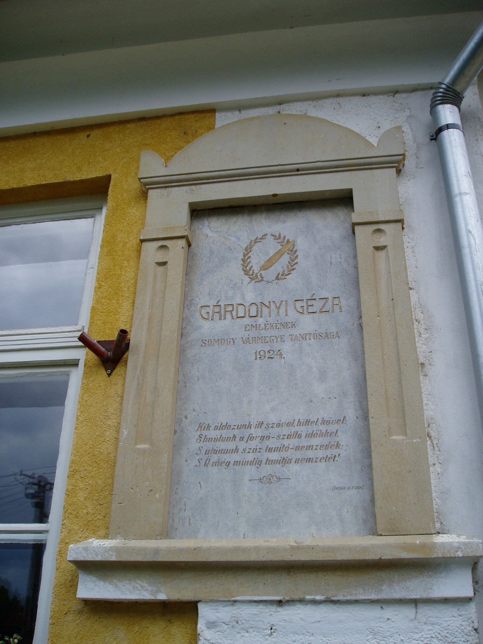 Nyilvános 1166 | 2013 | Karád, Gárdonyi Géza utca 2. | A klasszicista formáját ma is őrző földszintes iskolaépület falán két emléktábla is olvasható. A korábbi, 1924-ben avatott tábla Gárdonyi Géza írónak állít emléket, aki — még mint Ziegler Géza — itt kezdte tanítói pályafutását 1882-ben. Később írásaiban kissé keserűen, csalódottan örökítette meg ezt az időszakot. Az én falum című novelláskötete a karádi, nem éppen felhőtlenül boldog éveket, anyagi nyomorúságát idézi, ugyanakkor felejthetetlen képet rajzolt benne a környezetről és a falusi emberekről. A másik emléktábla Kodály Zoltánt idézi, aki 1933 és 1938 között több alkalommal is járt a községben. Ide, az iskola épületébe hívta össze Happ József tanító az énekelni szerető falusiakat, s Kodály népdalokat gyűjtött tőlük. Happ József hamarosan Budapesti lakásán kereste fel Kodályt, s felkérte, hogy a gyűjtött dalokból állítson össze egy csokrot a falu fennállásának 1934-ben ünnepelt 800. évfordulójára. Így született meg Kodály nevezetes férfikari műve, a Karádi nóták – Karád 800 éves évfordulójának ünnepére, amellyel halhatatlanná tette a kis falu nevét. A fénykép 2005 júliusában készült. Felh. irod.: Látnivalók Somogy megyében. Miskolc, Well-PRess, 2000 /Vendégváró/ Herke Mihály: „Kocsmárosné gyöngyviolám” – Kodály és Karád. = Somogy 1982. 6. |