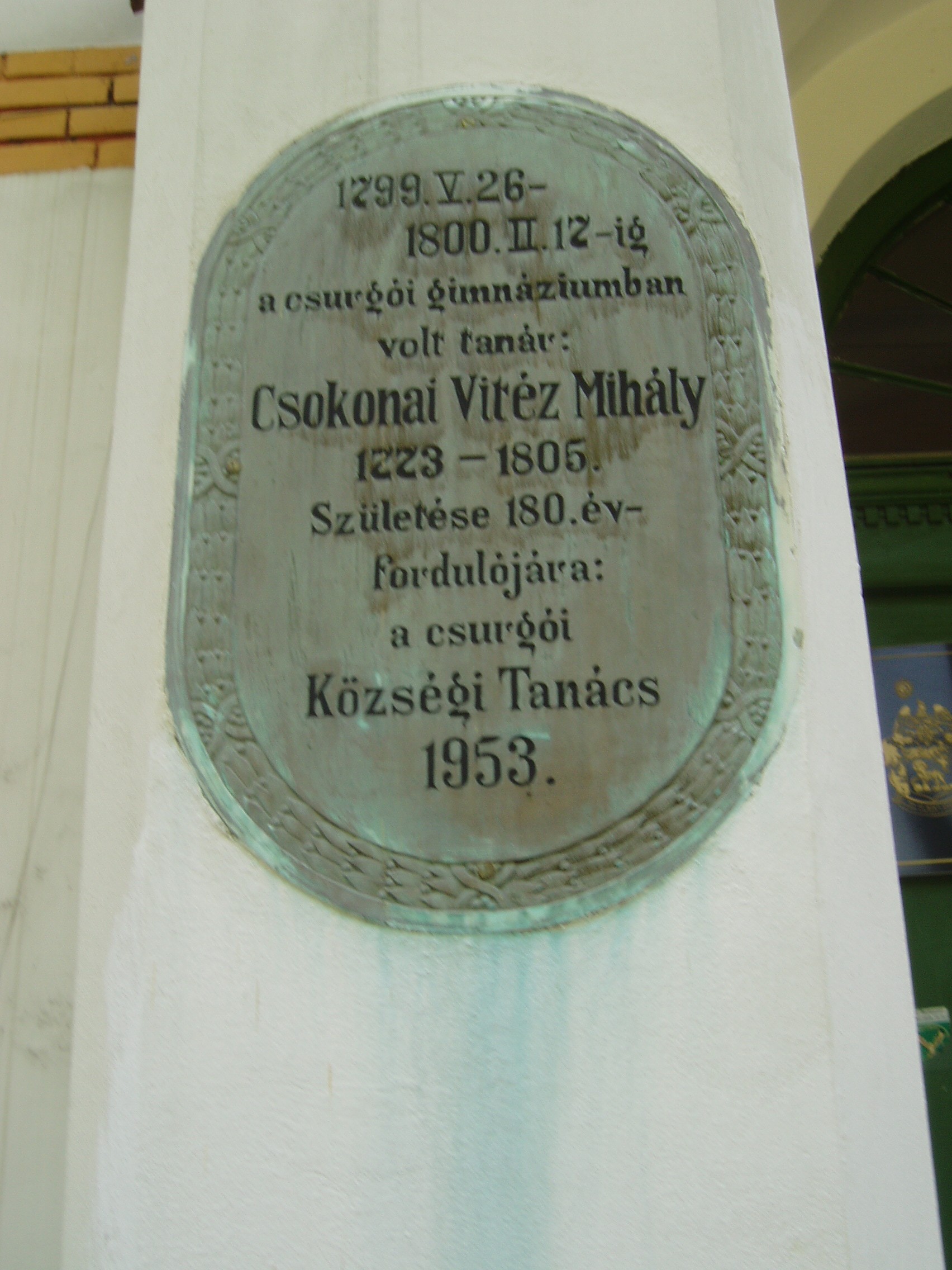 Nyilvános 1495 | 3841 | Csurgó, Széchenyi tér 9. Csokonai Vitéz Mihály Református Gimnázium és Általános Iskola | A XVIII. század végén alapított somogyi "első oskola" száz évvel később, 1897-ben költözhetett be új, mostani, akkor még csak egyemeletes otthonába. Az intézmény első, történelmi épületében (lásd: Csokonai u. 24.) ma a Városi Múzeum gyűjteménye tekinthető meg. A gimnázium mai épülete a régi iskola közelében, hatalmas parkban - az egykori vadasparkban - áll. Kapuja mellett 1953-ban állított emléktábla tudatja, hogy egykor az intézmény elődében tanított Csokonai Vitéz Mihály. A nagy szárnyas ajtón az iskola aulájába lépve két szép, vörös márványba foglalt bronz dombormű fogadja a látogatót: Festetics György, az iskolaalapító gróf és az intézmény halhatatlan segédtanára, Csokonai Vitéz Mihály. Az 1931-ben felavatott domborművek alkotója Horvay József szobrászművész. Az Alapító és a Költő domborművén kívül az egykori neves tanárok arcképcsarnoka is a hagyományok tiszteletére figyelmezteti a diákokat, látogatókat. Méltán híres az iskola muzeális könyvtára is. A fénykép 2004 októberében készült. Felh. irod.: Horváth József: Csurgó. Műemlékek. Bp. Tájak, Korok, Múzeumok Kiskönyvtára 441. 1982 Csurgói kalauz. Szerk. Terényi Zoltán. 1974 Látnivalók Somogy megyében. Miskolc, Well-PRess Kiadó, 2000 www.vendegvaro.hu |
