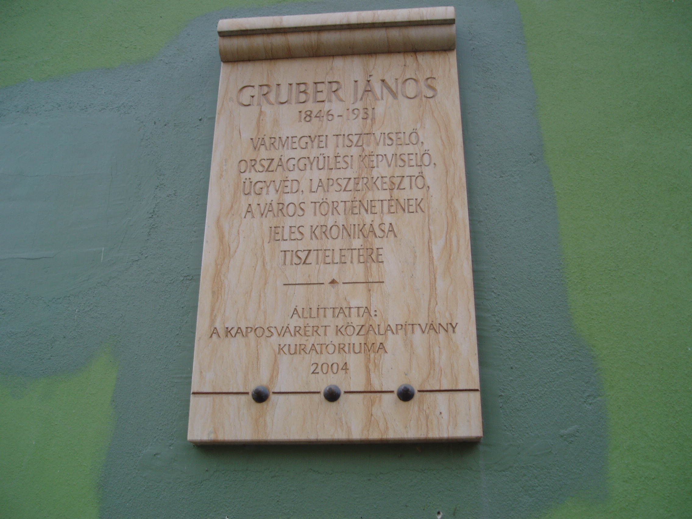 Nyilvános 1189 | 1892 | Kaposvár, Zárda utca 7. | A Somogyi Hírlap épületének homlokzatán 2004-ben avatták fel Gruber István emléktábláját (eredetileg a Városházára tervezték, mert ott volt a munkahelye). Gruber János (1846-1931) jogász, segédszolgabíró, 48-as párti országgyűlési képviselő, pénzügyi tisztviselő, publicista. Két jelentős írással ajándékozta meg Kaposvár városát. Az első 1913-ban jelent meg “Morzsák a negyvenéves asztalról” címmel, a második korrajzot 1928-ban “Morzsák az ötvenéves asztalról” címmel írta meg. A fénykép 2006 márciusában készült. Felh. irod.: http://www.somogyitemetkezes.hu/temetok.php?id=65 |