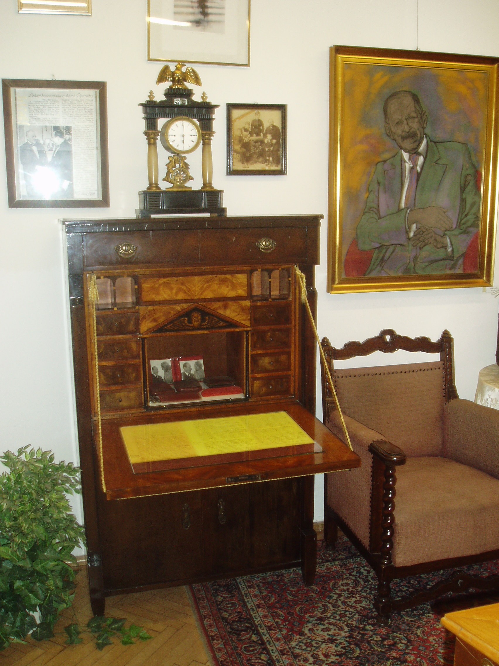 Nyilvános 1225 | 1936 | Siófok, Kálmán Imre sétány 5. | Ebben a vasútállomáshoz közeli házban született 1882-ben a magyar operett egyik legjelentősebb zeneszerzője, Kálmán Imre. Szülőházában — amelyet először 1955-ben jelöltek meg emléktáblával — 1970-ben özvegye, Kálmán Vera jelenlétében emlékszobát avattak. A mostani, gazdagabb anyagú emlékmúzeumot a zeneszerző születésének 105. évfordulója alkalmából, 1987. október 22-én nyitották meg. Jelenleg az emlékmúzeum a szülőház földszinti termeiben található, az emeleten kortárs képzőművészeti időszaki kiállításokat szoktak rendezni. Kálmán Imre számos személyes tárgyát állították itt ki enteriőr-szerűen. A tárgyak között látható látható Kálmán Imre kedves karosszéke és szekretere, amelyen sok gyönyörű dallamot vetett papírra. A fénykép 2006 júliusában készült. Felh. irod.: Kálmán Imre Múzeum Siófok. Szerk. Koch József. Siófok, 2000 http://www.kalmanimre-muzeum.hu/ |