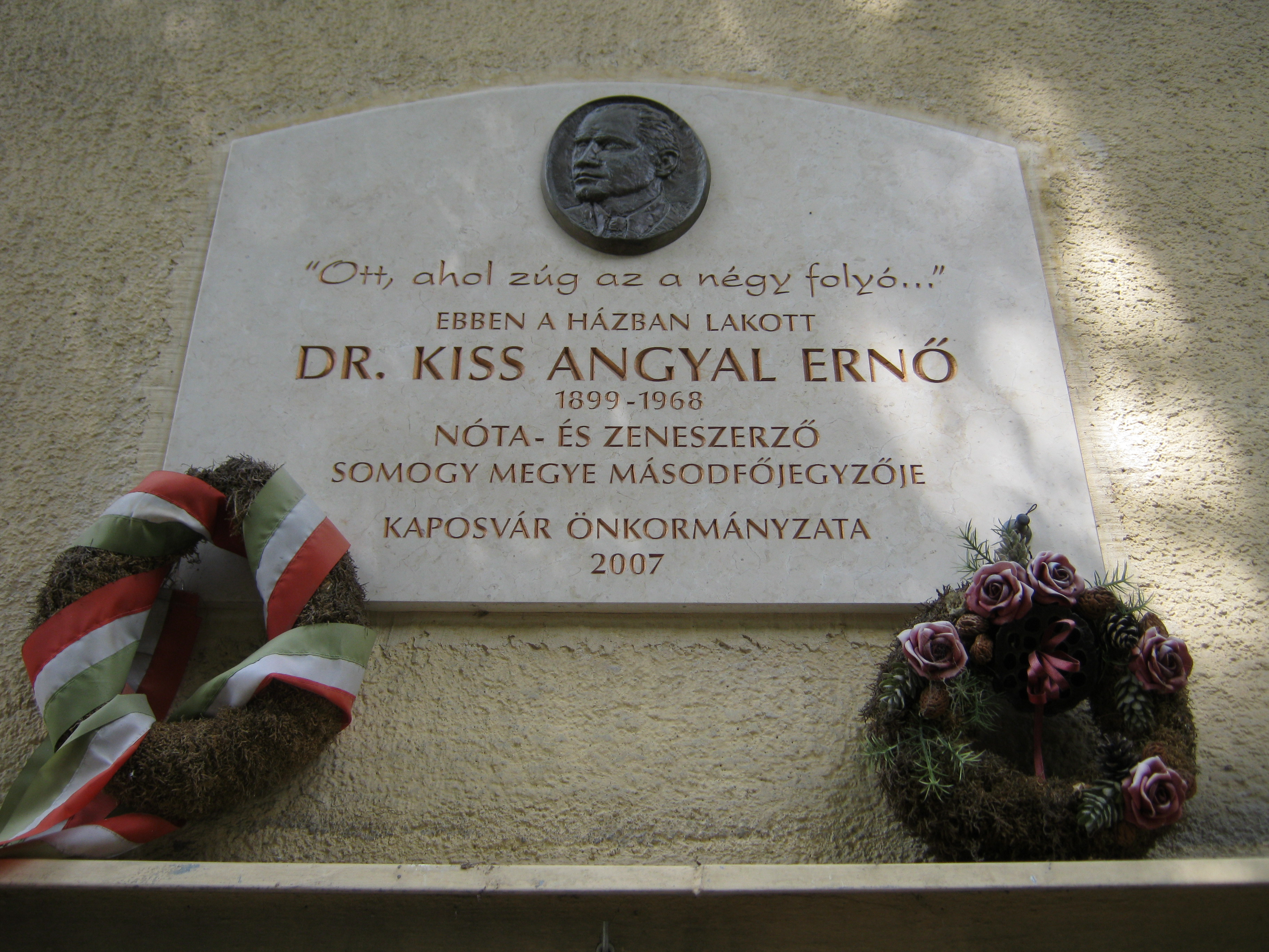 Nyilvános 1156 | 1681 | Kaposvár, Bajcsy-Zsilinszky utca 5. | Ebben a házban lakott Kiss Angyal Ernő (1899-1968), Somogy megye egykori helyettes főjegyzője, ismert nótaszerző. Több dalát itt komponálta. Emléktábláját 2007. október 1-jén, a Zene Világnapja alkalmából állították. A fénykép 2010 augusztusában készült. |