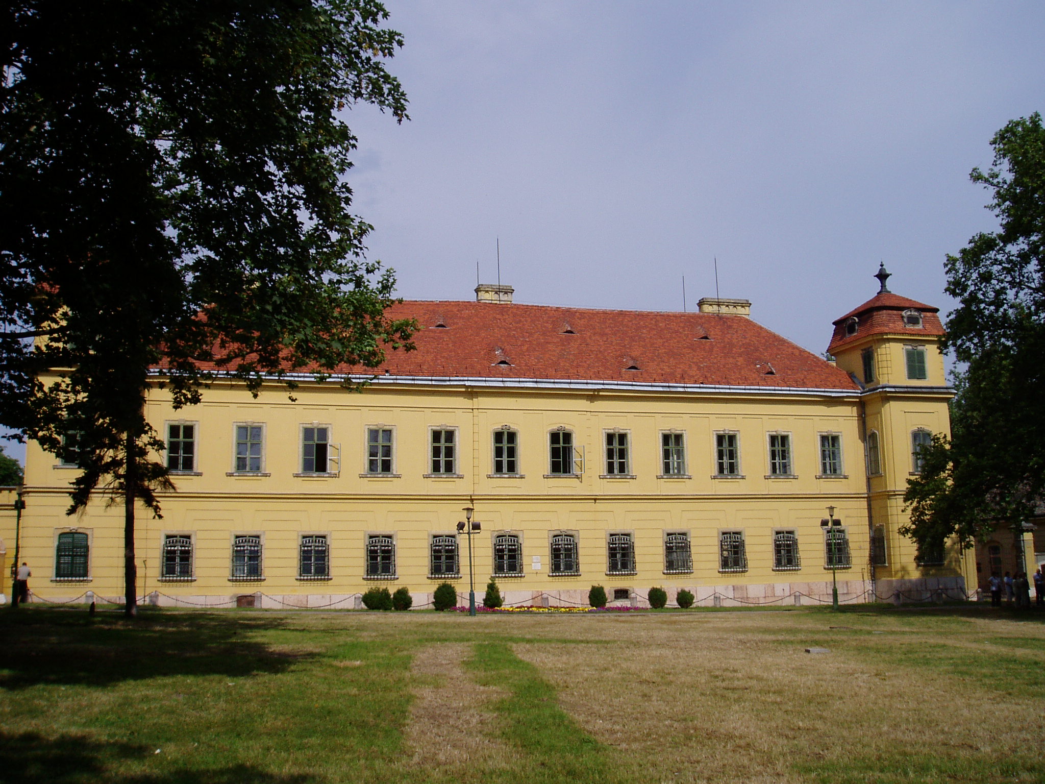 Nyilvános 1474 | 3308 | Tata, Kastély tér: Esterházy-kastély | Az Esterházy–kastély műemléki együttese az Öreg–tó partján, a középkori vár közvetlen szomszédságában áll. Fellner Jakab tervei szerint a XVIII. század második felében épült az Esterházy–család fraknói ága számára, későbarokk stílusban, a kiváló építész egyik legjelentősebb műveként. Fellner a hazai késő barokk, illetve korai klasszicizmus egyik legjelentősebb építésze, munkássága a mai napig meghatározza Tata városképét. Az épület több alkalommal is jelentős szerepet játszott a történelemben. 1809-ben I. Ferenc osztrák császár és felesége, Ludovika ide menekültek Napóleon hadai elől. Hosszú hetekig itt laktak, s az uralkodó itt, az északi szárny toronyszobájában írta alá az ún. Schönbrunni békét. 1897-ben Ferenc József és II. Vilmos német császár látogattak ide egy tatai hadgyakorlat alkalmából. 1921-ben az utolsó magyar király, IV. Károly menekült ide feleségével a balul végződött budaörsi csata után, s itt vették őket őrizetbe. A fénykép 2005. júliusában készült. Felh. irod.: Polgárdy Géza: Tatatóváros és környéke kalauza. Az 1939-es kiadás reprintje. Tata, Móricz Zsigmond Városi Könyvtár, 1998 Magyar kastélylexikon 4. Komárom-Esztergom megye kastélyai és kúriái. Bp. Perfect Project, 2003 |