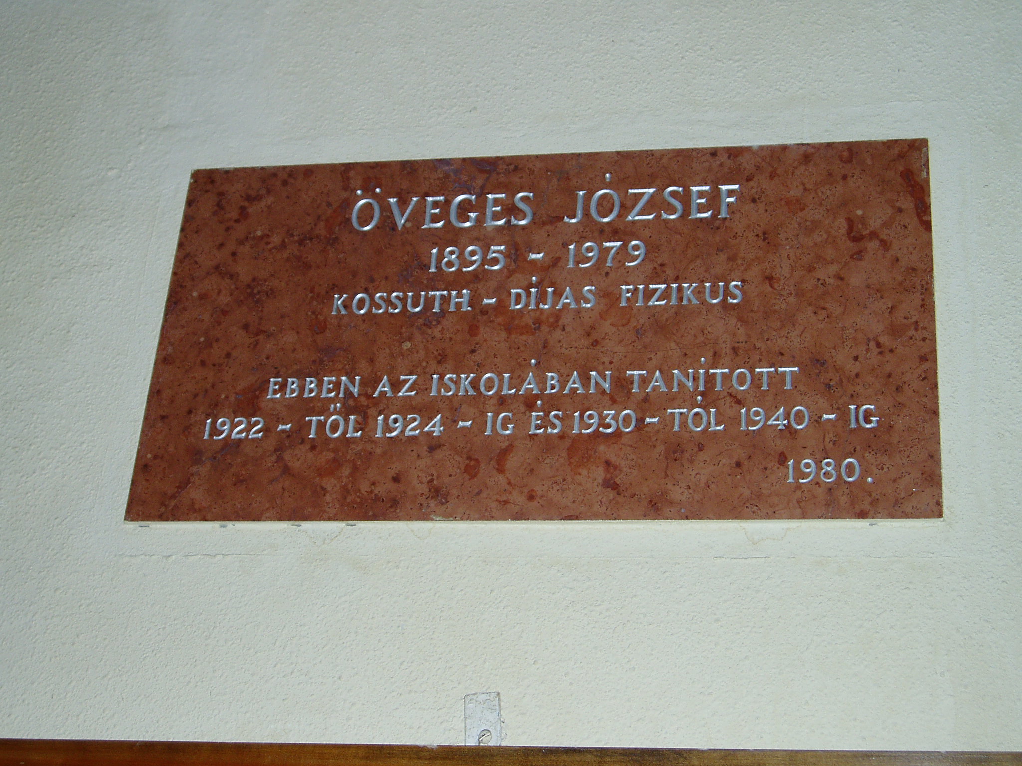 Nyilvános 1455 | 3194 | Tata, Tanoda tér 5. Eötvös József Gimnázium: Öveges József emléktáblája | A tatai gimnáziumot 1765-ben gróf Esterházy Miklós alapította, s vezetésére a piarista tanítórendet kérte fel. Az iskola kezdetben a közeli majki kamalduli szerzetesek többször is átalakított gazdasági épületeiben működött. A jelenlegi iskolaépületet a XX. század elején emelték, 1912-ben kezdődött meg benne a tanítás. Az első emeleti folyosó falán neves egykori tanárok és diákok emléktábláit helyezték el. Öveges József (1895-1979) piarista tanár, Kossuth-díjas fizikus ebben az épületben tanított 1922-1924 és 1930-1940 között (közben Vácott működött). Tatán döntötte el, hogy tudományos könyveket ír az ifjúságnak. Szerette volna feltárni az újabb nemzedékeknek a fizika csodáit, szépségeit. Fizikai kísérleteiről már akkor legendákat regéltek. Népszerűsége abban rejlett, hogy a legbonyolultabb kísérleteket is olyan nemes egyszerűséggel tudta elmondani, hogy azt még az iskolázatlan ember is megérthette. Tata 1964-ben díszpolgárává nyilvánította. Nevét az Öveges József Fizikai Emlékverseny is őrzi, amelyet évről-évre egykori tatai iskolájában rendeznek meg. A fénykép 2005. júliusában készült. Felh. irod.: www.eotvos-tata.sulinet.hu Grósz Andrea: Fizikus reverendában. = www.sulinet.hu/eletestudomany Öveges József. = www.mult-kor.hu |