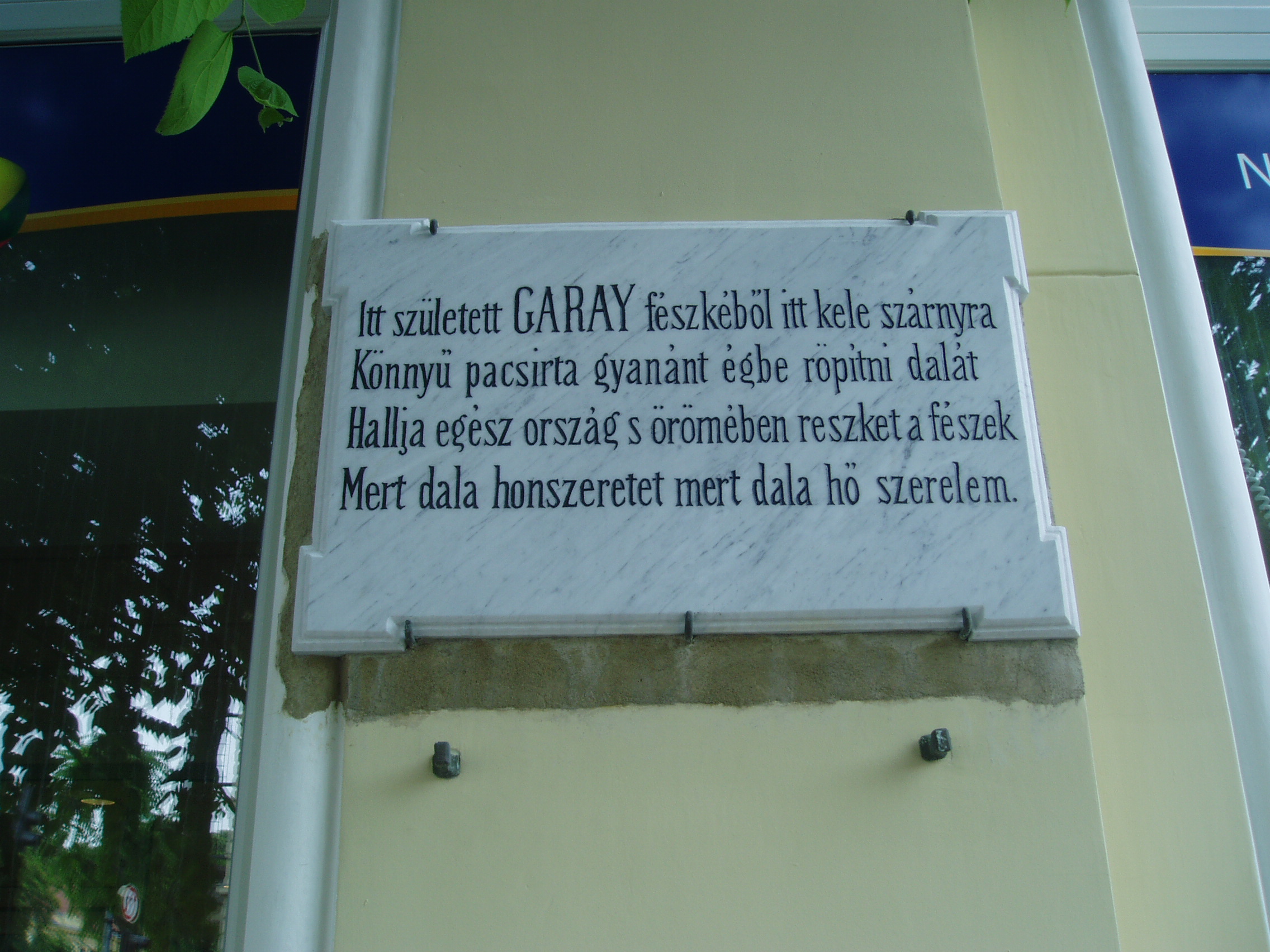 Nyilvános 1129 | 1687 | Szekszárd, Széchenyi utca 40. Diczenty-ház | A mostani városi bérpalota, a XIX. század végén eklektikus stílusban épült ún. Diczenty-ház helyén állott az a földszintes sarokház, amelyben Garay János költő született. 1881-ben még az eredeti házon helyezték el a költő emléktábláját, amelyet aztán áttettek a helyére épült Diczenty-házra. Ma viszont az eredeti táblának már csak egy másolata látható, csak Szász Károly verssorai ugyanazok... Az 1812. október 12-én született Garay János apja kereskedő, árvaszéki teendőkkel megbízott, köztiszteletben álló szekszárdi polgár volt. Anyja, Valter Ilona tizenkét gyermeknek adott életet. A szekszárdi gyermekkor meghatározóvá vált a költő számára. Házukban otthonos volt az új magyar irodalom, és Garayban hamarosan mutatkozott a költői hajlam. Legismertebb műve, Háry Jánosról szóló elbeszélő költeménye is szekszárdi élményből született. A fénykép 2006 júliusában készült. Felh. irod.: www.csatolna.hu/hu/korbejart/garay.shtml Hegedűs Géza: A magyar irodalom arcképcsarnoka. Bp. Trezor, 1993 |