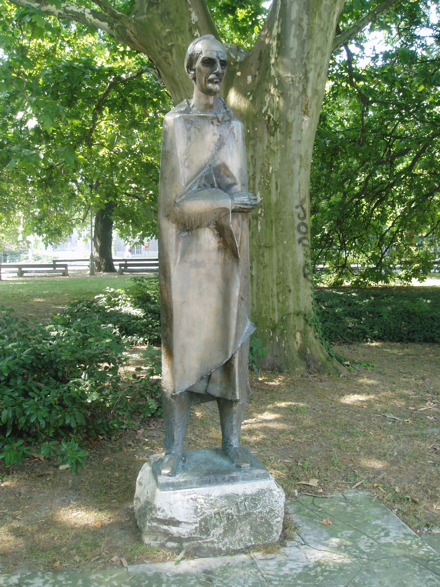 Nyilvános 1088 | 1831 | Szekszárd, Sétakert: Babits Mihály szobra | A szekszárdi születésű (lásd: Szekszárd, Babits M. u. 13.) Babits Mihály egészalakos szobrának alkotója Kis Kovács Gyula szobrászművész. A bronzszobrot 1971-ben állították fel a Babits nevét viselő művelődési ház melletti kis téren. Onnan helyezték át a mai helyére, a Sétakert platánjai alá. A fénykép 2006 júliusában készült. Felh. irod.: www.szekszard.hu |