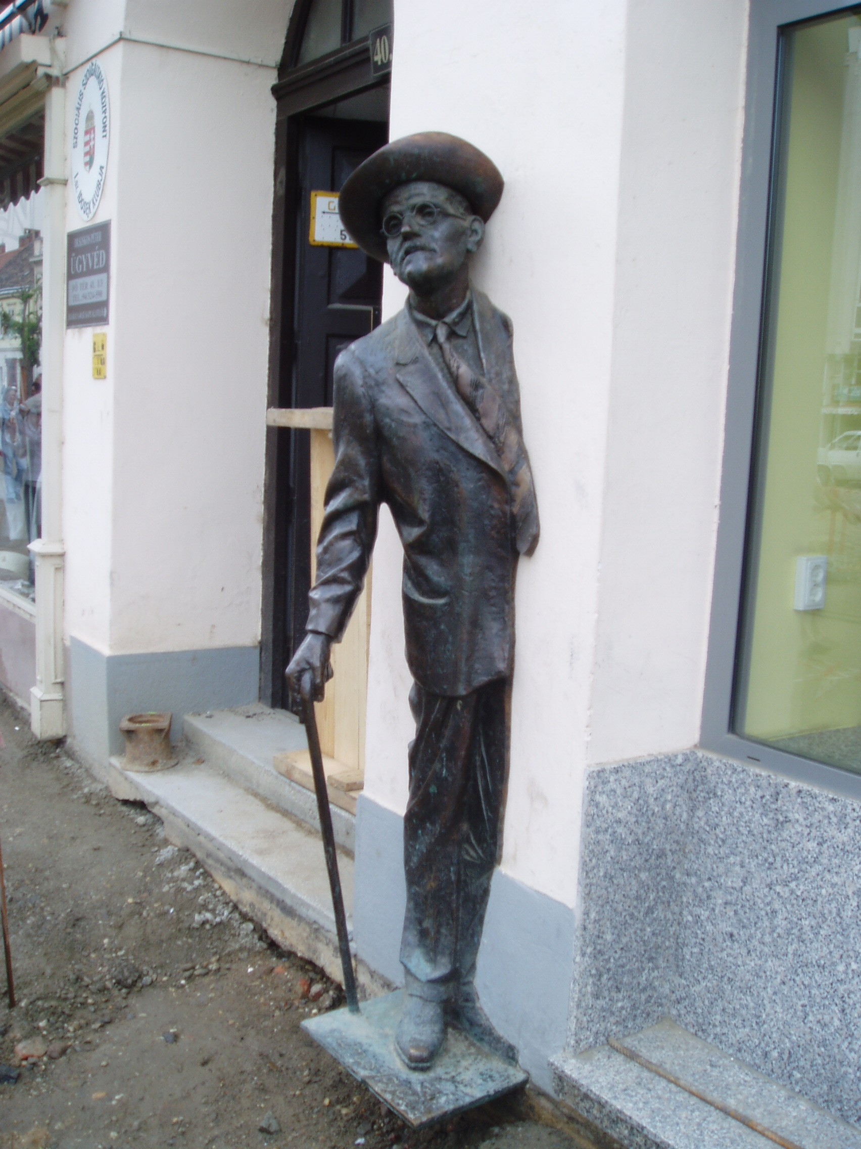 Nyilvános 1091 | 1761 | Szombathely, Fő tér 40. | 2004-ben ezen a helyen állították fel James Joyce író életnagyságú szobrát, Veres Gábor alkotását, amint a ház falából kilépve üdvözli az arra járót. Magyar és angol nyelvű felirat hívja fel a figyelmet, hogy Joyce híres regényének, az Ullyssesnek a hőse, Leopold Bloom (Virág Lipót) szombathelyi származásúnak mondja magát. A helytörténeti kutatások szerint az 1800-as évek közepén valóban élt Blum család Szombathelyen, akik annakidején ebben a házban laktak. Joyce talán trieszti tartózkodása idején kerülhetett valamelyikükkel kapcsolatba. A modern irodalom alapművének számító Ulysses, a kisember odüsszeiája június 16-án, egy nap alatt játszódik Dublinban. Az 1950-es évek óta a Joyce rajongók világszerte kortárs művészeti fesztiválokkal ünneplik ezt a napot (Bloomsday), amelynek már Szombathelyen is hagyománya van: az első magyar James Joyce Társaság is Szombathelyen alakult meg 2001-ben. A téma iránt érdeklődőnek érdemes elolvasni Najmányi László: A Blum ház rejtélye c. regényét (Golyós Toll Kft. – DIREKT kiadó, 2007). A fénykép 2006 májusában készült. Felh. irod.: www.bloomsday.hu A Bloomsday Szombathelyen. = www.litera.hu www.joyce.hu |