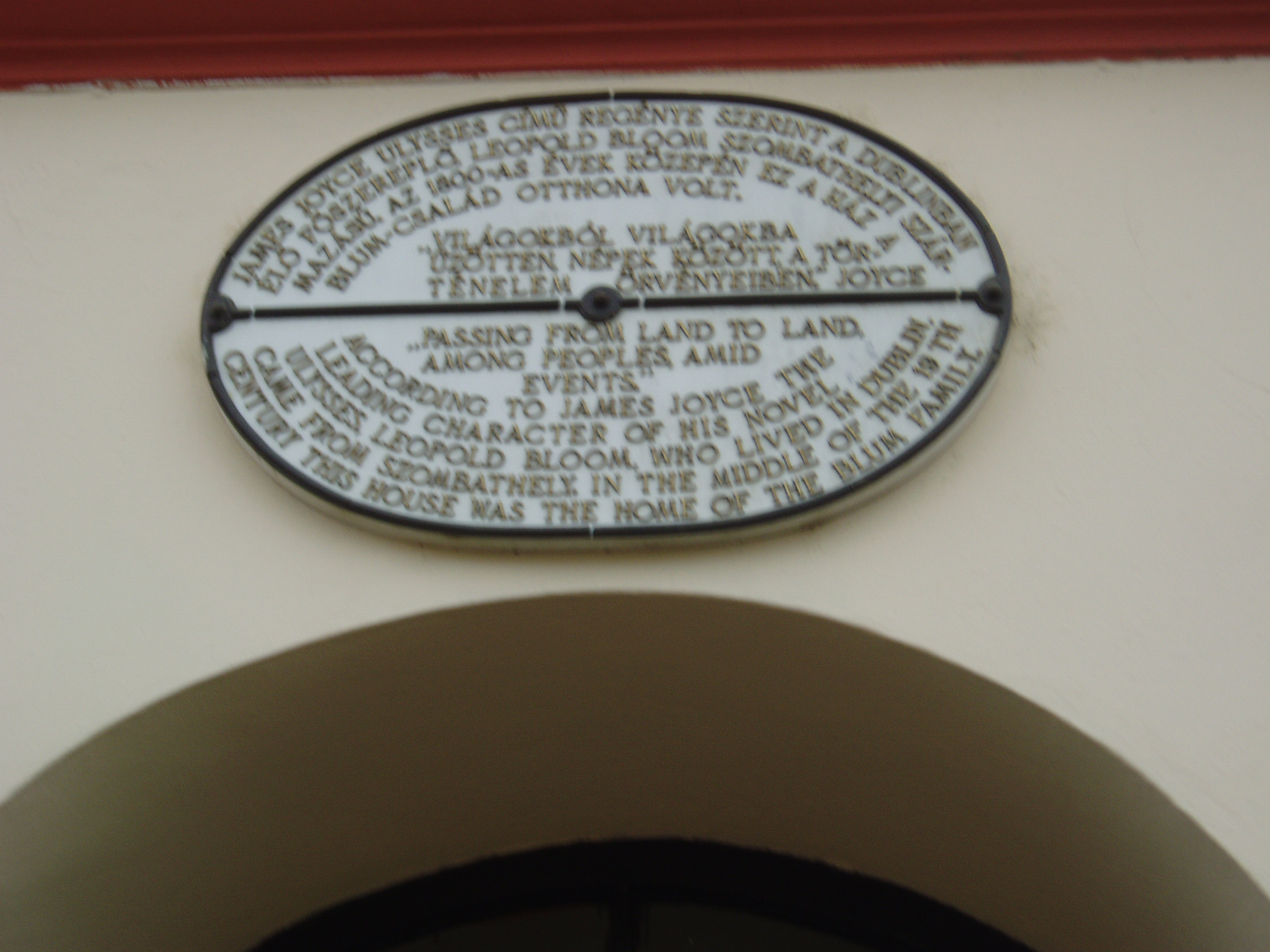 Nyilvános 1108 | 1777 | Szombathely, Fő tér 40. | 2004-ben ezen a helyen állították fel James Joyce író életnagyságú szobrát, Veres Gábor alkotását, amint a ház falából kilépve üdvözli az arra járót. Magyar és angol nyelvű felirat hívja fel a figyelmet, hogy Joyce híres regényének, az Ullyssesnek a hőse, Leopold Bloom (Virág Lipót) szombathelyi származásúnak mondja magát. A helytörténeti kutatások szerint az 1800-as évek közepén valóban élt Blum család Szombathelyen, akik annakidején ebben a házban laktak. Joyce talán trieszti tartózkodása idején kerülhetett valamelyikükkel kapcsolatba. A modern irodalom alapművének számító Ulysses, a kisember odüsszeiája június 16-án, egy nap alatt játszódik Dublinban. Az 1950-es évek óta a Joyce rajongók világszerte kortárs művészeti fesztiválokkal ünneplik ezt a napot (Bloomsday), amelynek már Szombathelyen is hagyománya van: az első magyar James Joyce Társaság is Szombathelyen alakult meg 2001-ben. A téma iránt érdeklődőnek érdemes elolvasni Najmányi László: A Blum ház rejtélye c. regényét (Golyós Toll Kft. – DIREKT kiadó, 2007). A fénykép 2006 májusában készült. Felh. irod.: www.bloomsday.hu A Bloomsday Szombathelyen. = www.litera.hu www.joyce.hu |