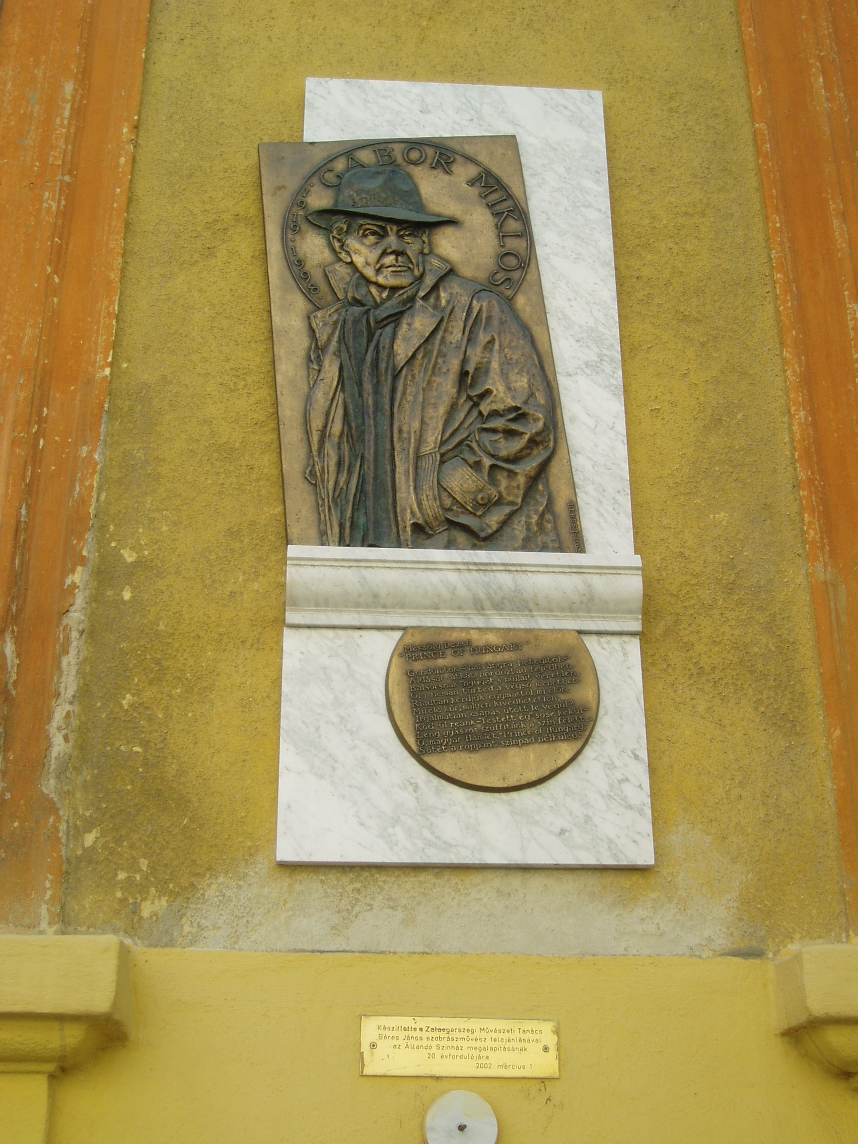 Nyilvános 1327 | 2676 | Zalaegerszeg, Ady utca 9. | Ebben a házban született 1919. április 7-én Gábor Miklós (1919-1998) színművész, rendező, író. Apja, Gábor Béla mozit üzemeltetett a városban Edison Filmszínház néven (az Arany Bárány szálloda háta mögötti épület 1945 után leégett). 1926-ban a család Székesfehérvárra költözött. Az ország egyik legnagyobb színészeként számon tartott művész 1983-ban visszatért szülővárosába: Ruszt József rendezésében az újonnan alapított zalaegerszegi színház állandó épületének megnyitó előadásán Lucifer szerepét játszotta Madách Imre: Az ember tragédiája című művében. A művész 1982-84 között a színház művészeti tanácsadója is volt. A szülőházán elhelyezett emléktábla domborműve legendássá vált modern, puhakalapos Luciferként örökítette meg. A felvétel 2006 júniusában készült. Felh. irod.: Zalai életrajzi lexikon. = http://zalai.dfmk.hu/zalaiak |