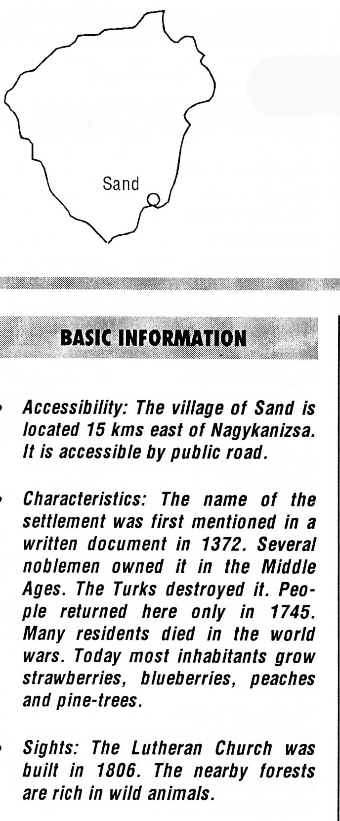 Nyilvános 2435 | 7764 | Rövid leírás | Teljes leírás (1020 B) | Sand BASIC INFORMATION Accessibility: The village of Sand is located 15 kms east of Nagykanizsa. It is accessible by public road. Characteristics: The name of the settlement was first mentioned in a written document in 1372. Several noblemen owned it in the Middle Ages. The Turks destroyed it. People returned here only in 1745. Many residents died in the world wars. Today most inhabitants grow strawberries, blueberries, peaches and pine-trees. Sights: The Lutheran Church was built in 1806. The nearby forests are rich in wild animals. This text came from the following book: Title: Handbook of Zala county (Zala megye kézikönyve) Series: County handbooks of Hungary (Magyarország megyei kézikönyvei) Chief editor: Hóbor József Publisher: (Hatvan), CEBA-Hungary Ltd, 1998 ETO: 908.439.121(035) ; 050.8(439.121) ISBN: 963-9089-18-2 Pages: 488-1040 p. Remark: Closed on: 1998. márc. 31. |